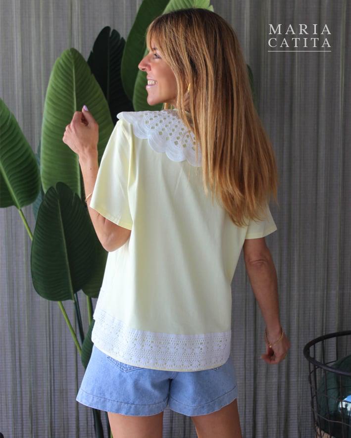 BLUSA AMARELO MANTEIGA COM GOLA BABETE BRANCA – MARIA CATITA – TAM U