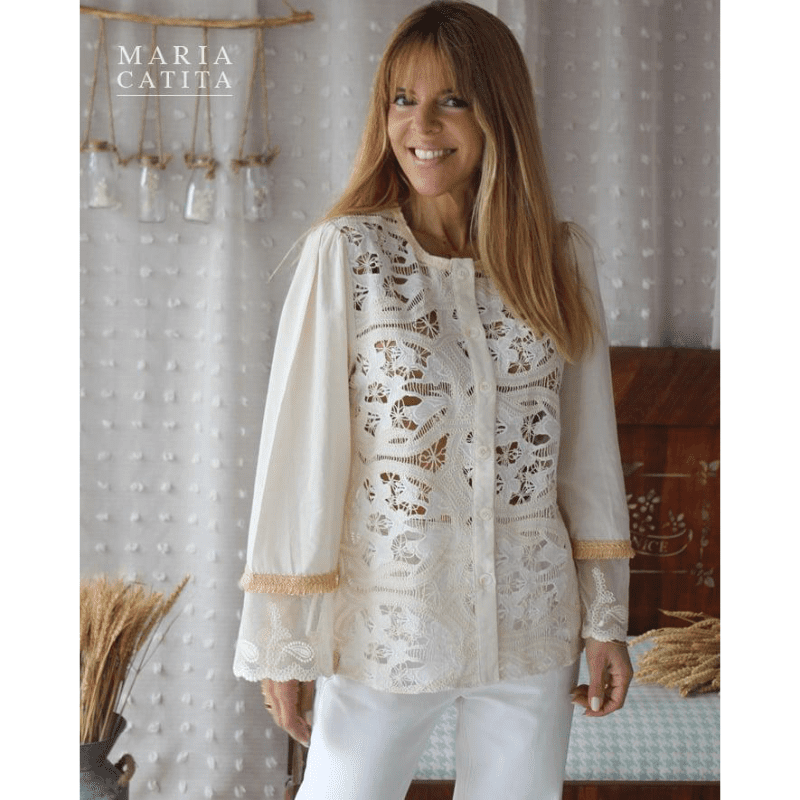 Blusa camiseiro, bege, com frente rendada. Manga comprida, larga, com detalhe de renda no punho e franja.