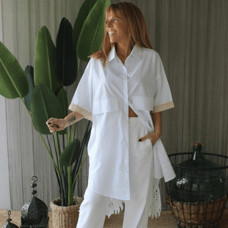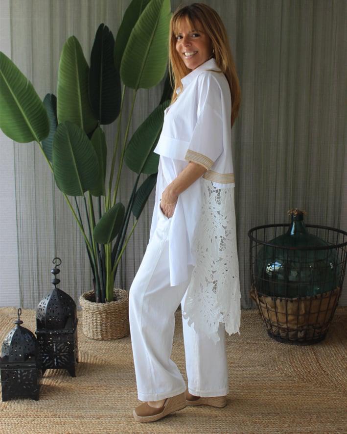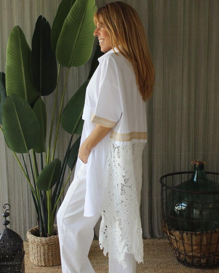 Blusa/camisa branca de manga curta, oversize, assimétrica. Detalhes dourados nas mangas e nas costas. Costas lisas até à cintura, renda até ao fundo.