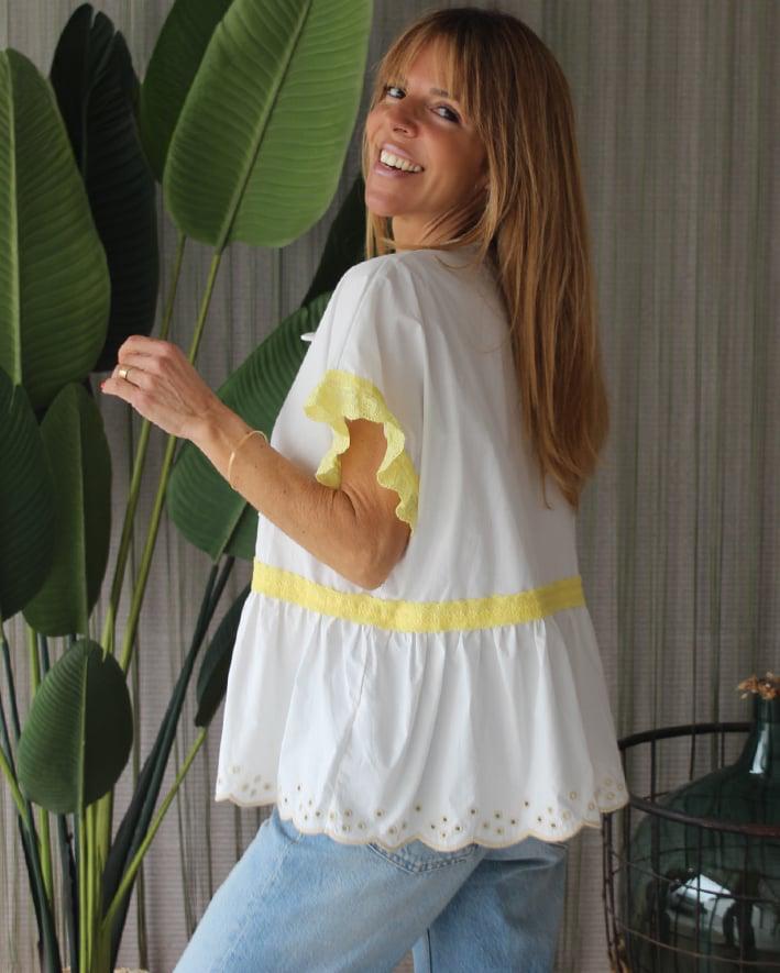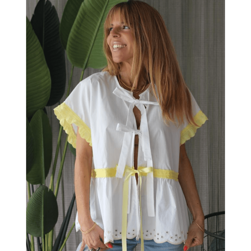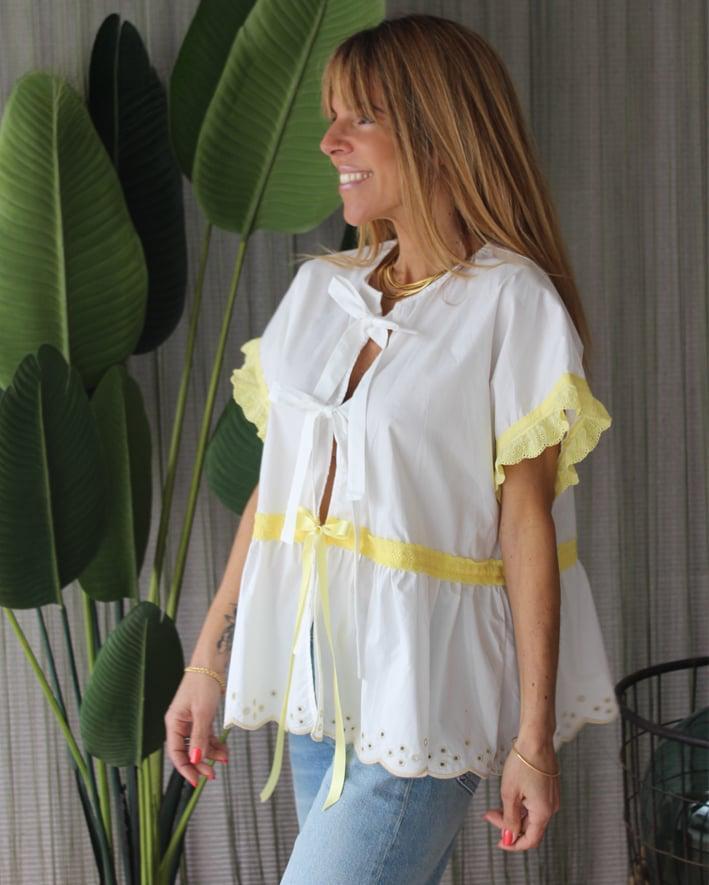 Blusa de manga curta, oversize, comprimento pela anca. Folho amarelo nas mangas e na cintura. Ata à frente com lacinhos brancos e fita de cetim amarela.