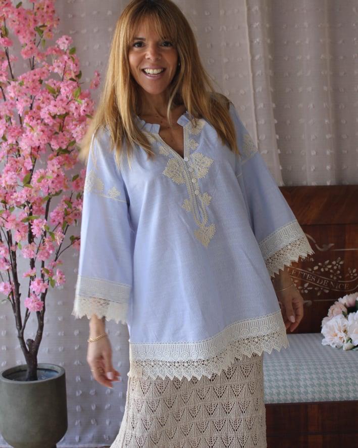 BLUSA/TÚNICA AZUL CLARO COM RENDA MARIA CATITA – TAM U