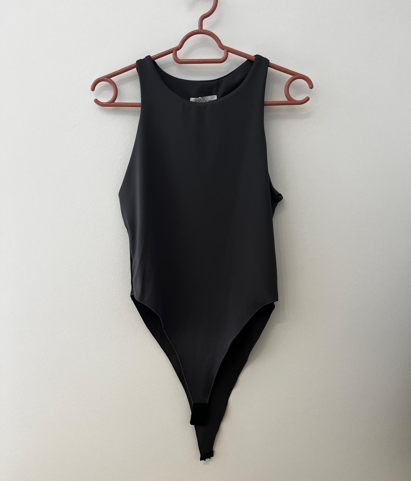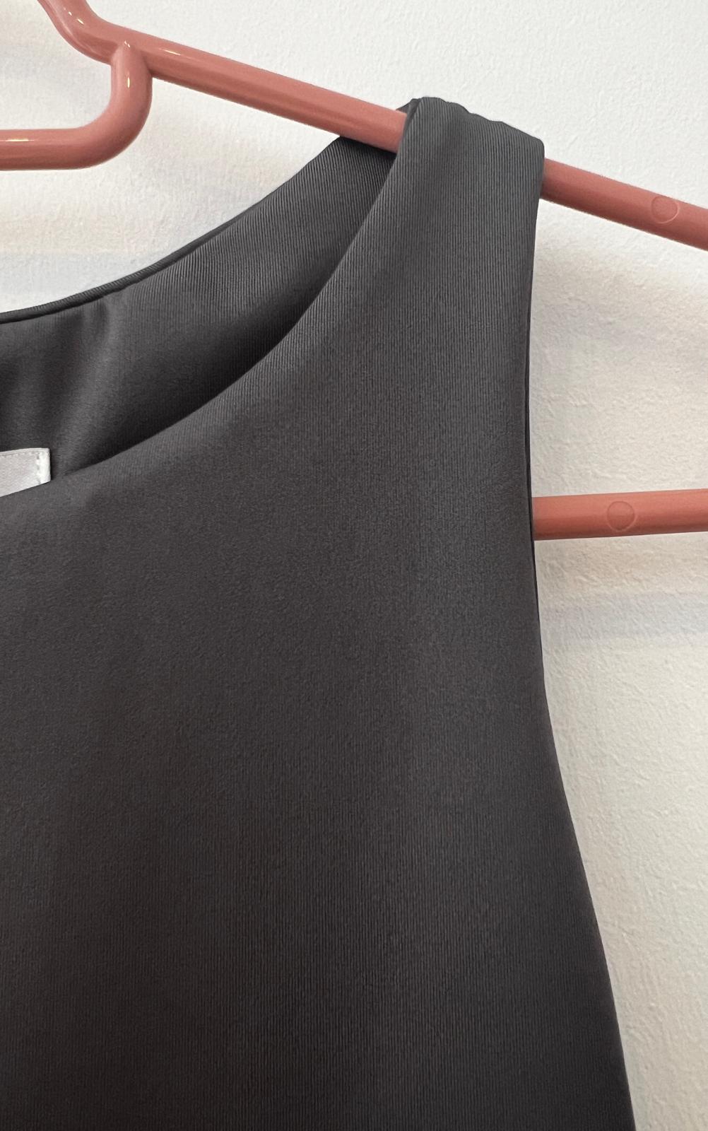 Body de cavas, decote redondo subido (à frente e atrás). É liso, em tom cinza rato.