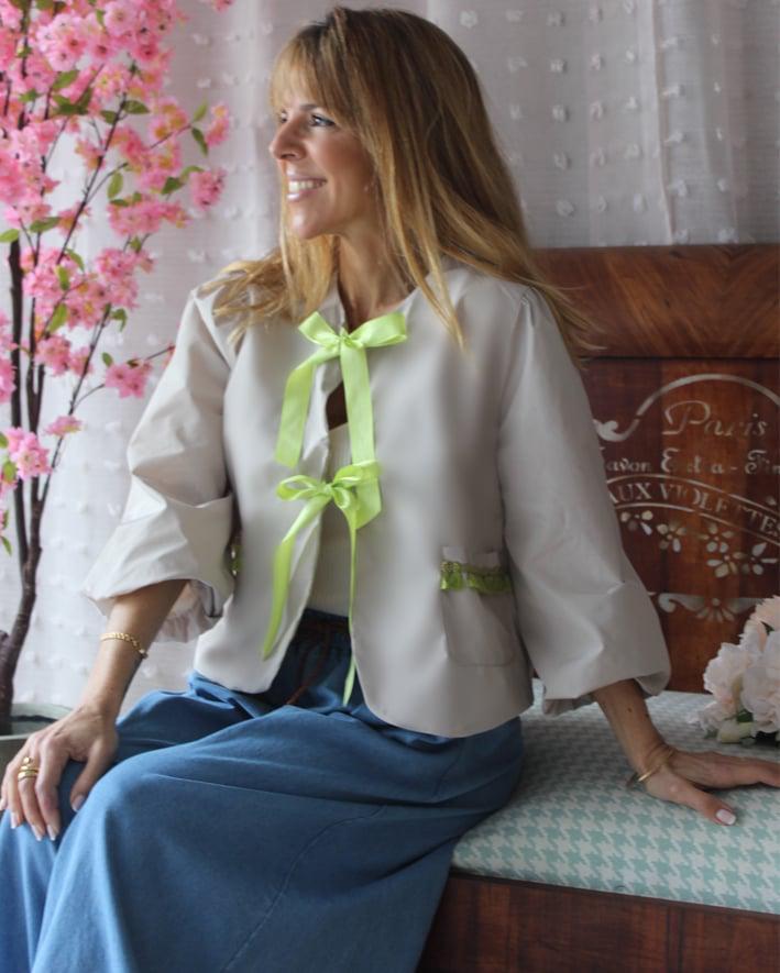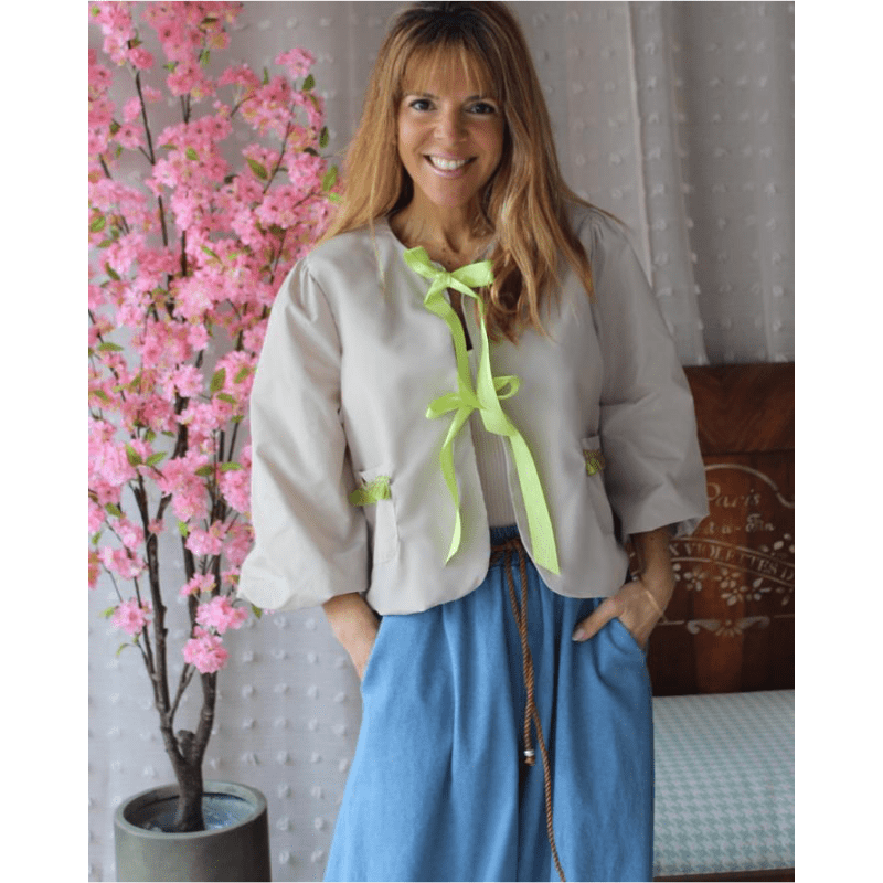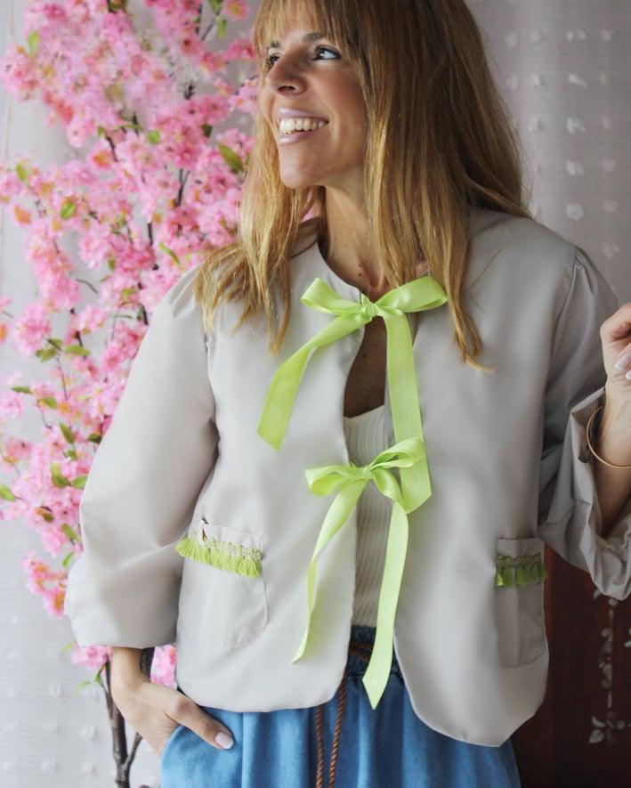Casaco curto bege, com detalhes verde alface nos bolsos dianteiros. Abotoa com laços em fita de cetim verde alface. Manga ligeiramente abalonada a 3/4.