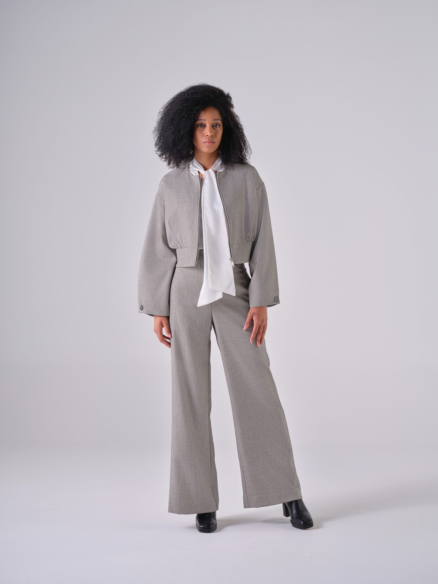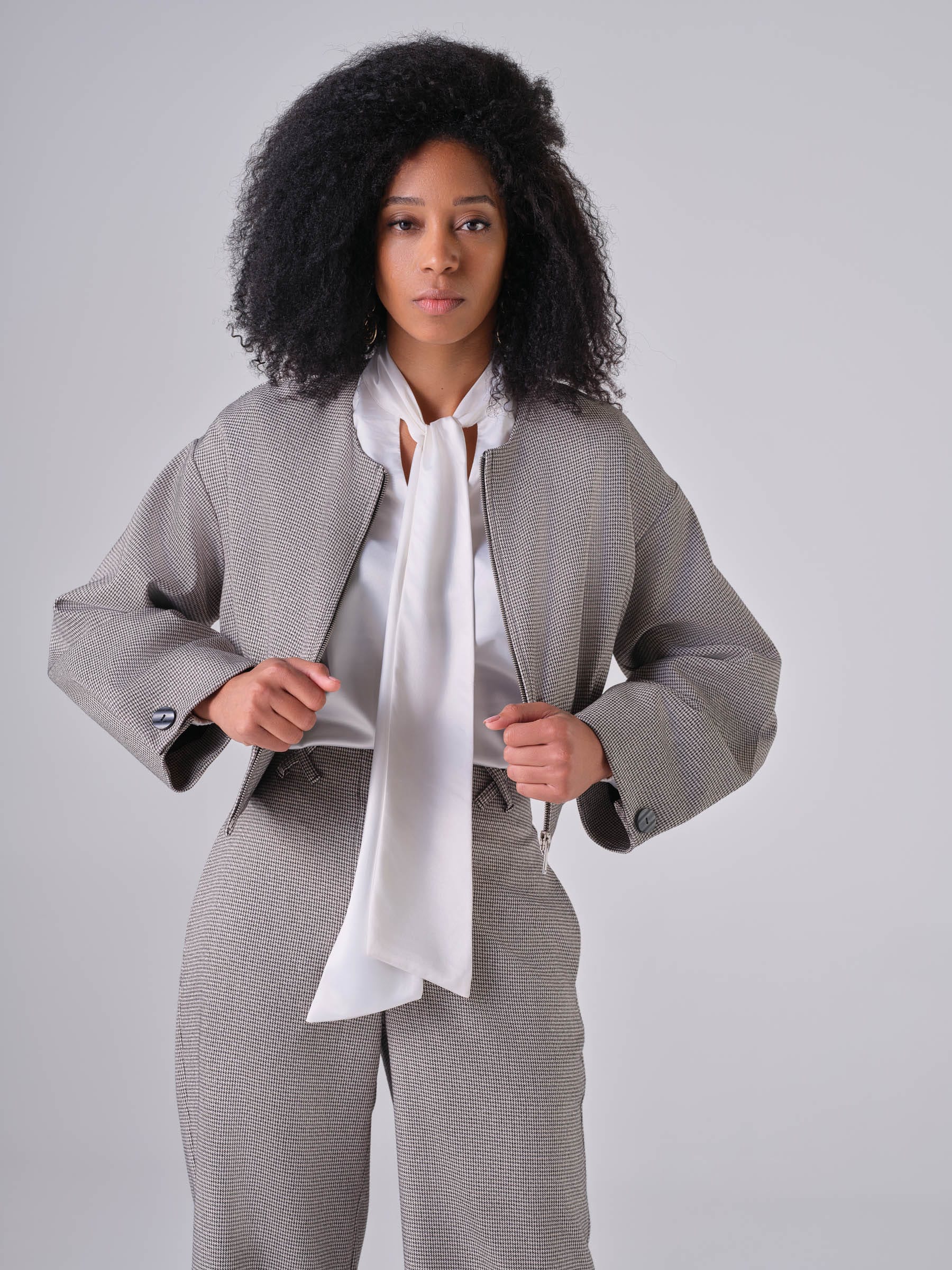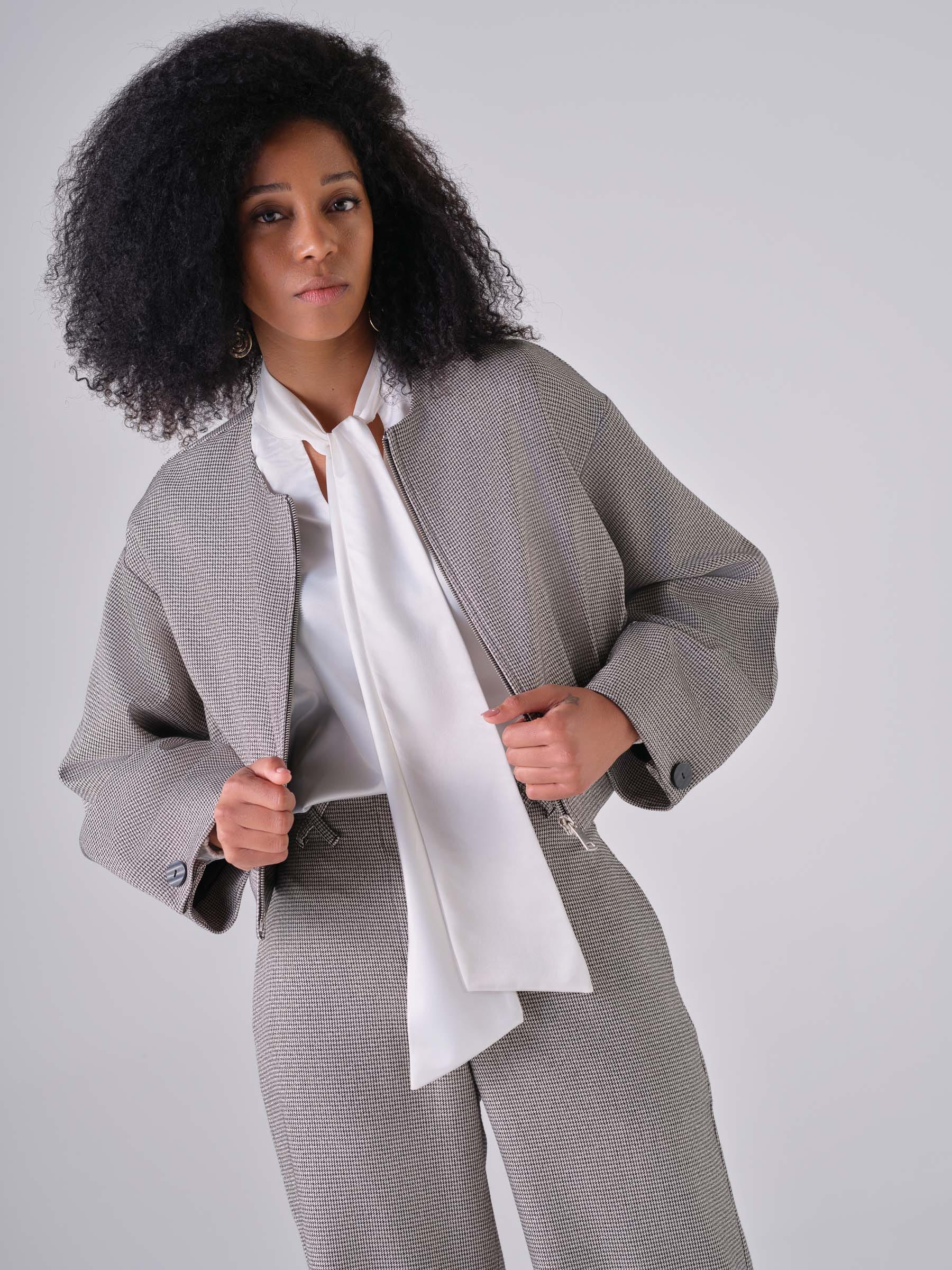 Casaco tipo bomber, “pata de galo”, com fecho, sem bolsos. Mangas largas, compridas, com detalhes.