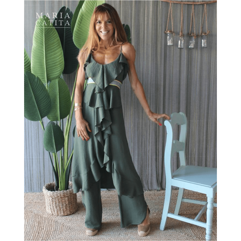 CONJUNTO CALÇA E TÚNICA DE FOLHOS VERDE MARIA CATITA – TAM U