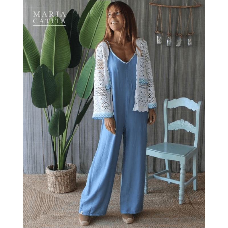 Conjunto composto por macacão e casaquinho de malha. Macacão de cor azul ganga, de alça fina e decote em V. Detalhe em zig-zag branco, a contornar o decote e a alça. Fecho atrás. O casaquinho branco, de manga comprida, em tecido trabalhado com transparências e com detalhes azul turquesa, completa este conjunto romântico.