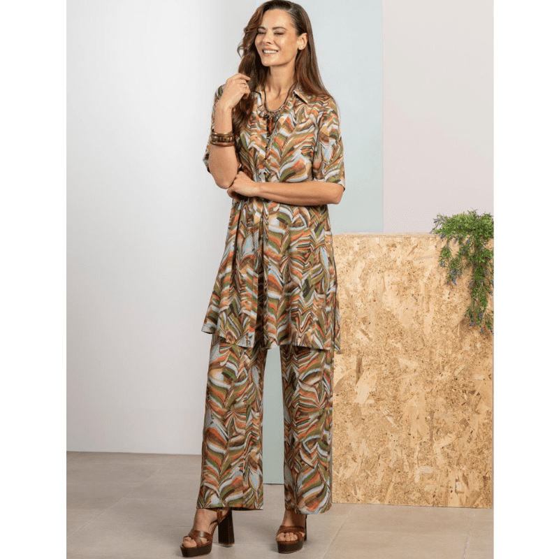 Conjunto túnica e calça estilo pantalona, multicolorido. Túnica com gola, decote em V e botões até à cintura, abrindo a partir daqui. Rachas laterais. Calça larga, com elástico na cintura.