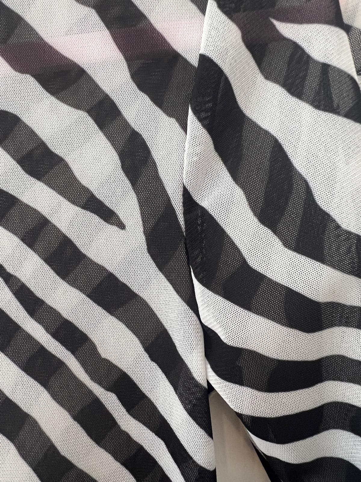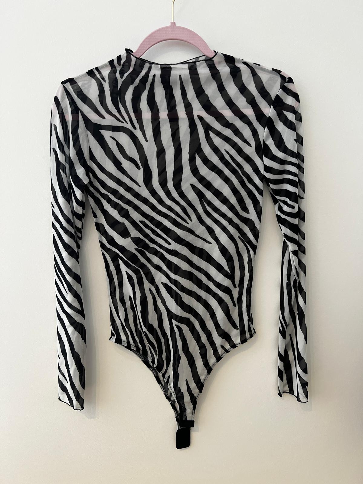 Body transparente, em padrão animal print zebra, de manga comprida.