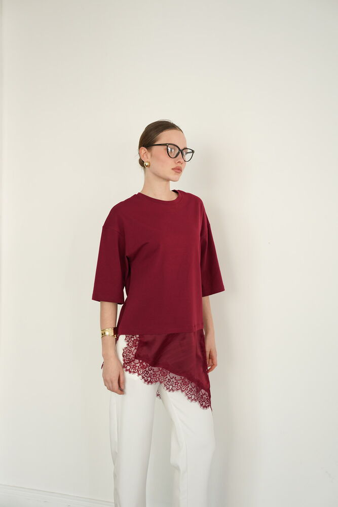 T-shirt tom burgundy, de decote redondo, com manga pelo cotovelo, com outra integrada, acetinada e com renda no mesmo tom, assimétrica, fazendo parecer um 2 em 1.