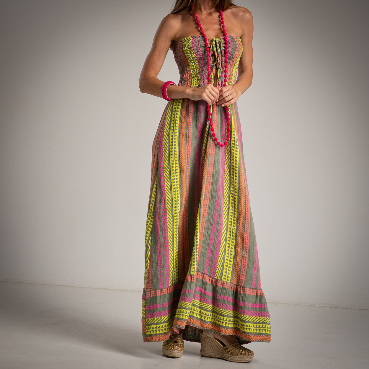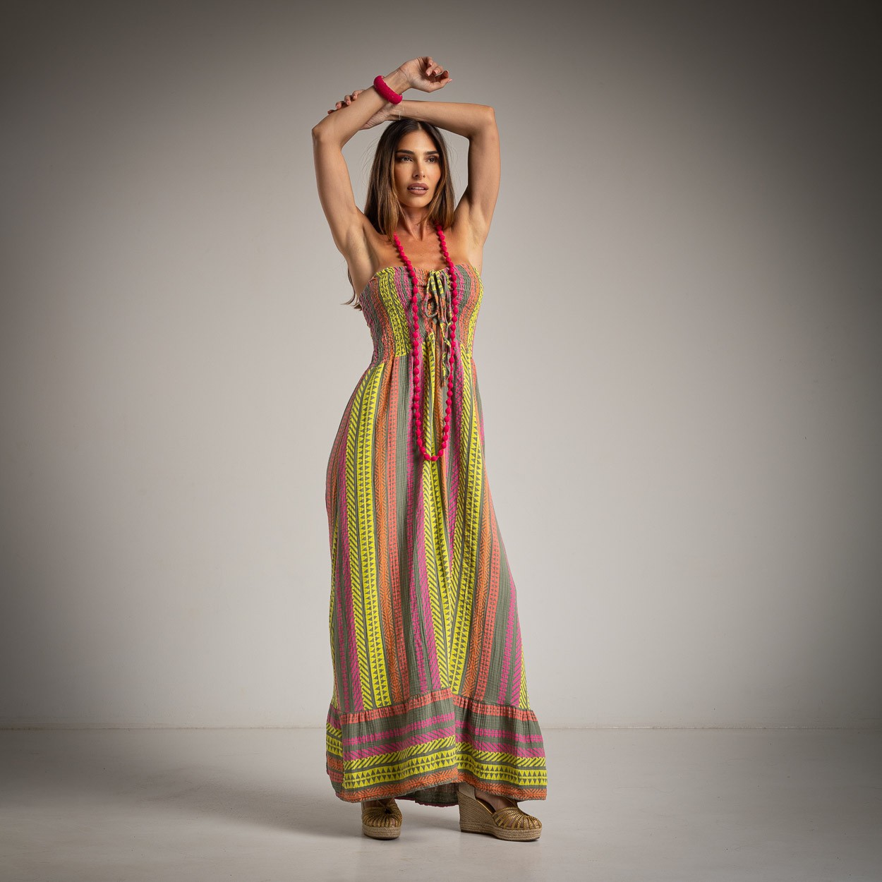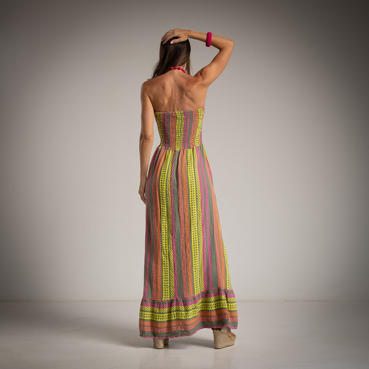 Vestido maxi, 100% algodão, tecido duplo, padrão multicor fluo, com peito e costas em franzido elástico. Frente ajustável com cordão. Corte bustier, havendo a possibilidade de colocar o cordão ao pescoço.
