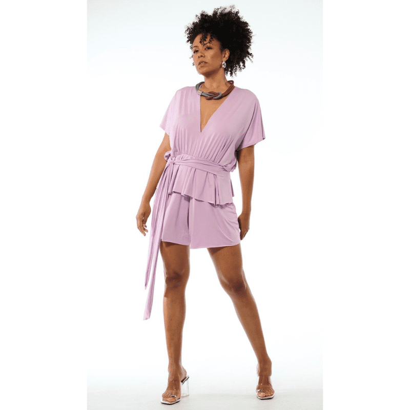 Macacão curto, fluído, sem mangas, com decote profundo à frente e atrás. Ata atrás com cordões. Cinto no mesmo tecido para melhor ajuste.