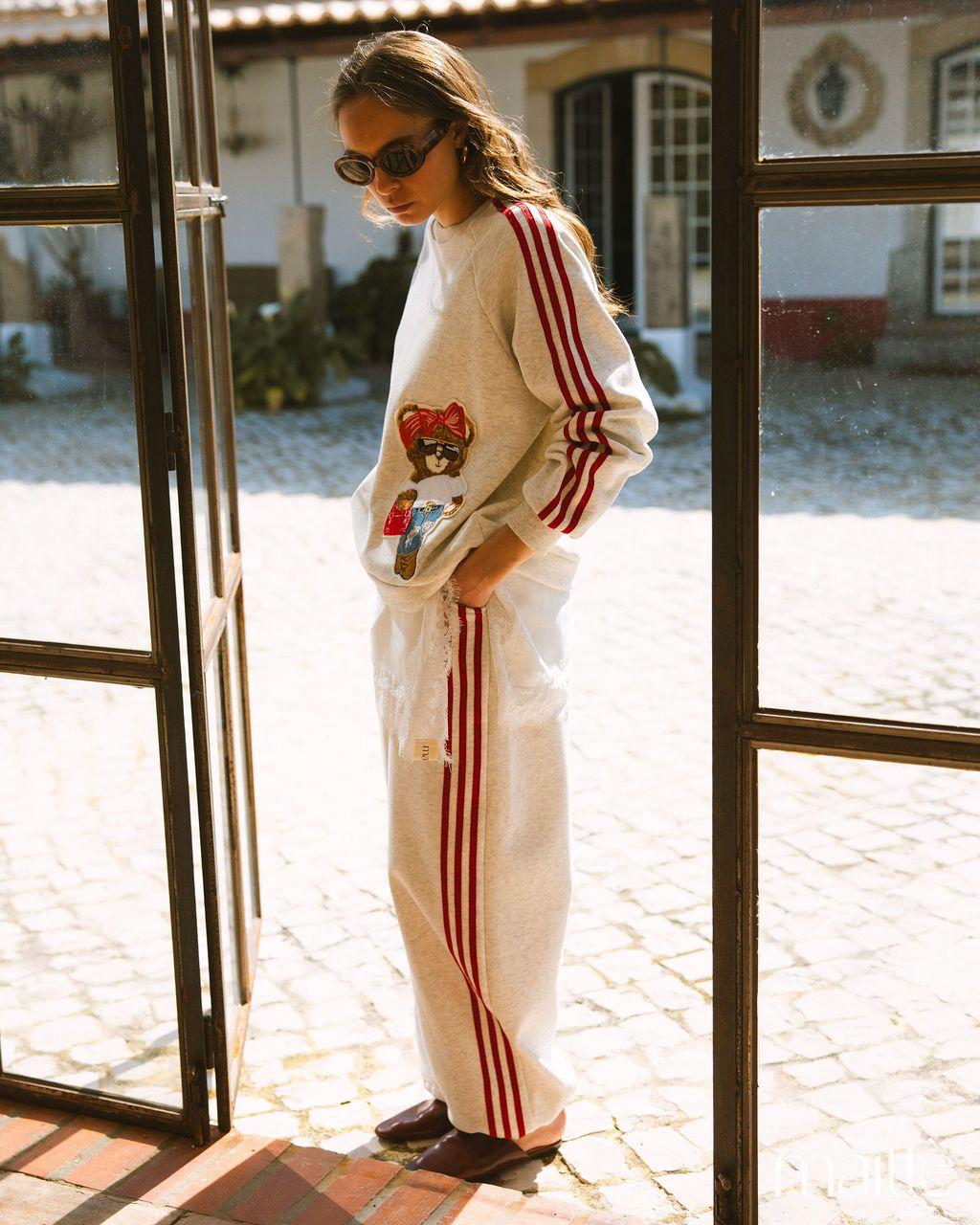 Calça training 100% algodão, tom bege com listas vermelhas laterais. Detalhe de ursinho numa das pernas.