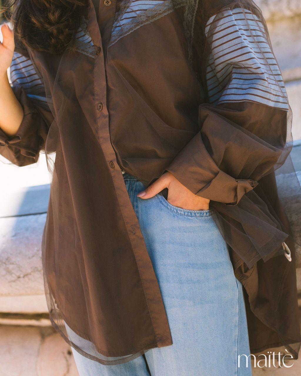 Camisa de manga comprida, num tom hiper tendência – castanho chocolate, com alguns apontamentos em azul claro. Gola em malha, estilo polo. Tem a particularidade de ter uma outra camisa, em tule transparente, por cima.