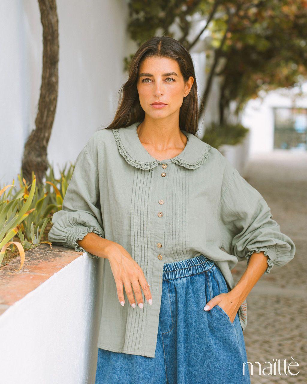 Camisa estilo boho chic, em cor verde menta. Nervuras frontais, gola babete trabalhada e manga abalonada.