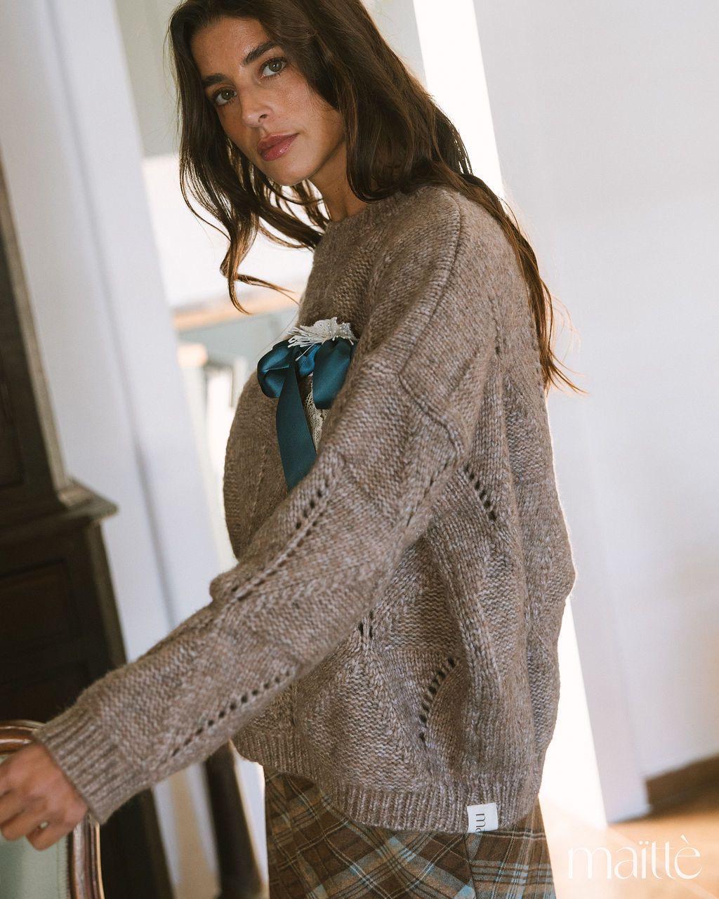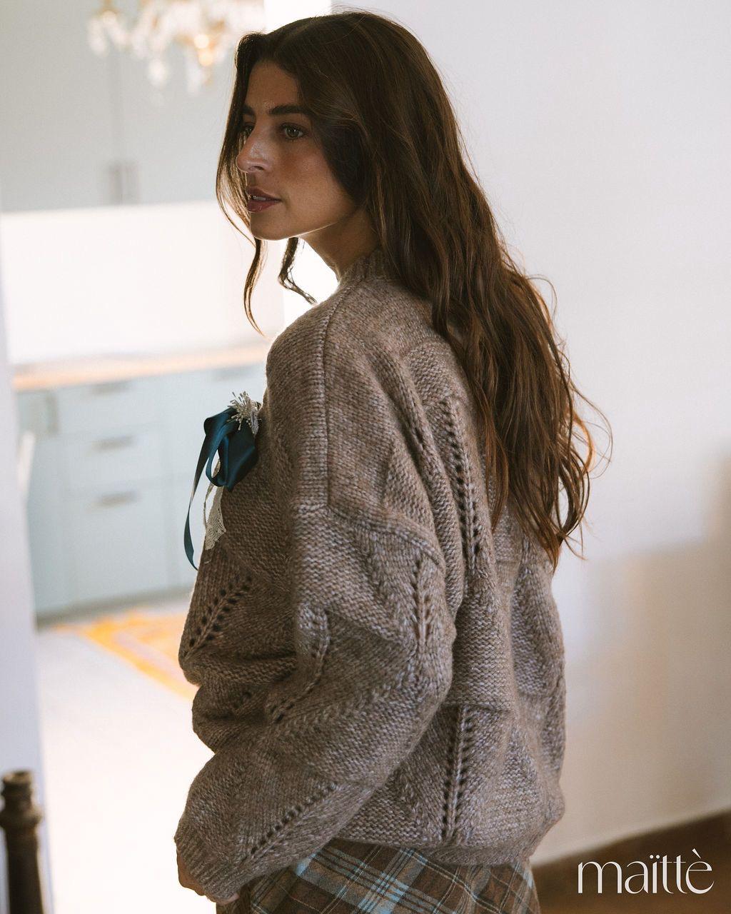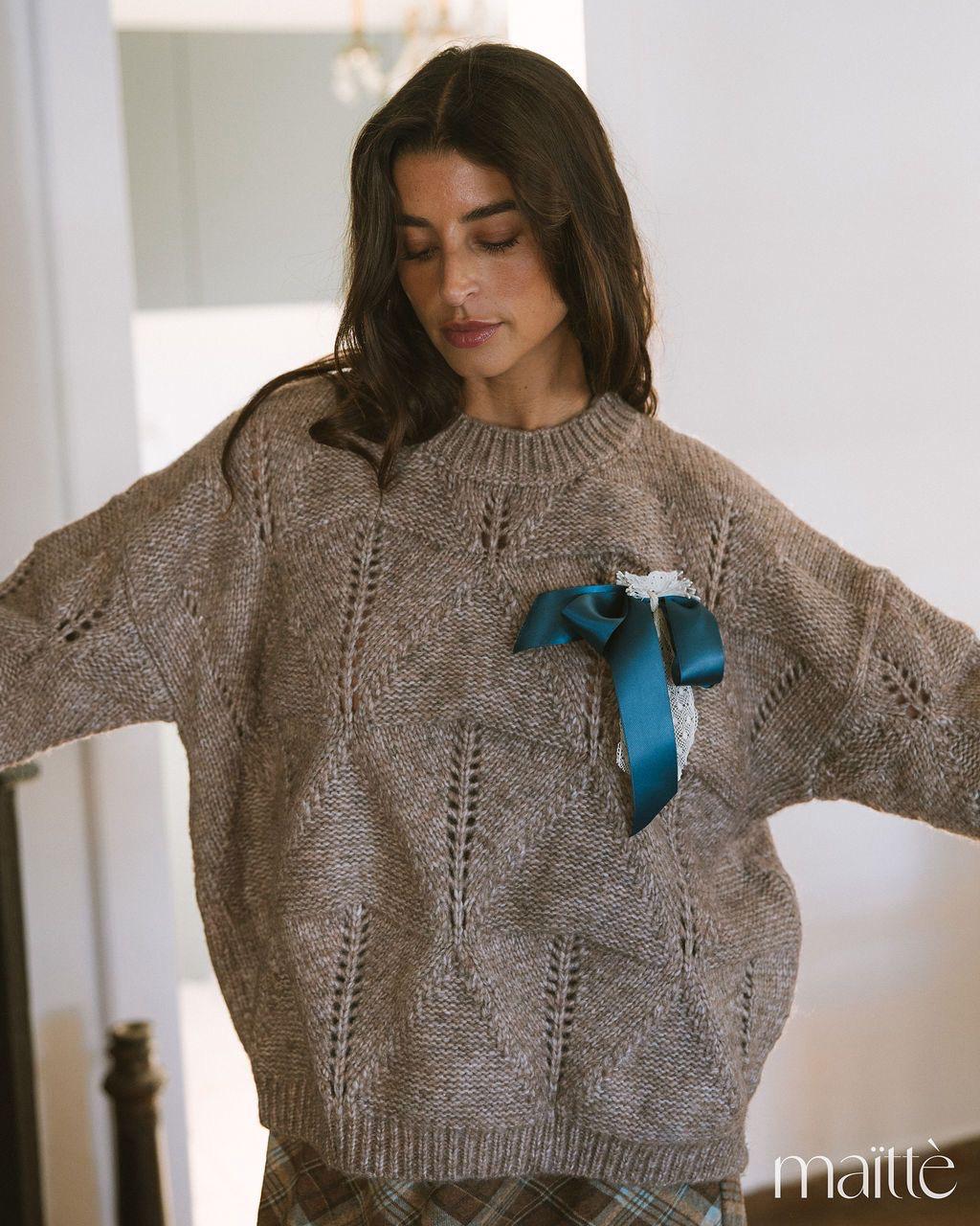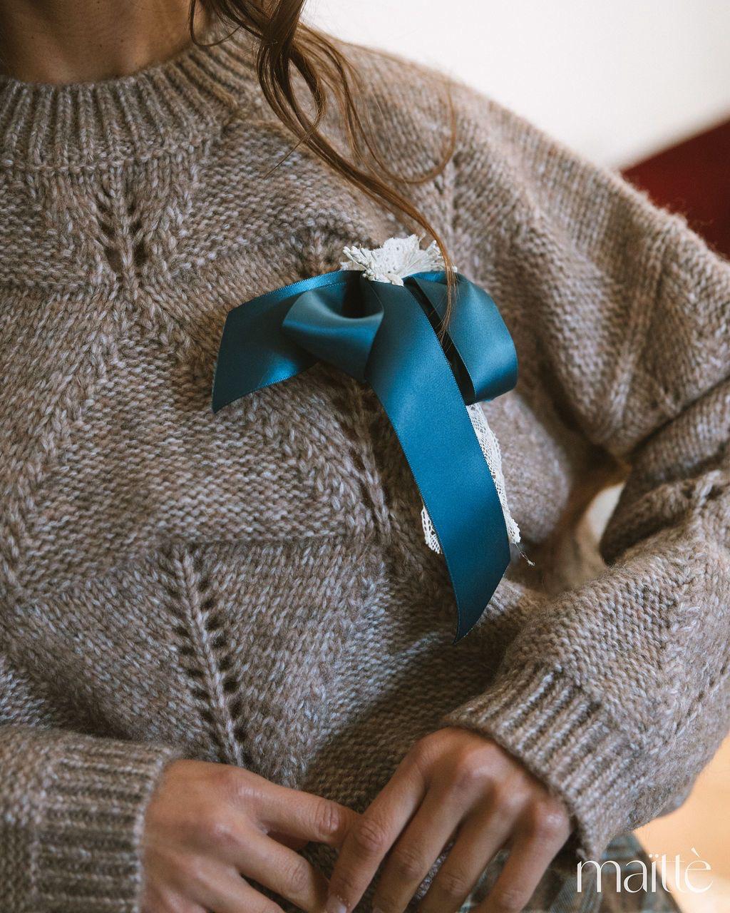 Camisola de lã, em tom castanho avelã. Corte ligeiramente oversize, comprimento médio. Alfinete de perito com laço em cetim azul petróleo e renda branca, amovível.