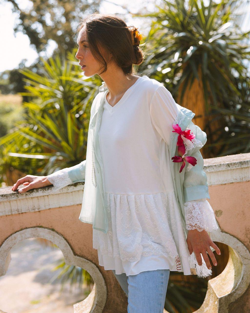 Conjunto composto por camisa em viscose, transparente, tom verde água, com interior todo forrado a renda branca, sendo as costas em renda branca transparente (um MUST!!) e alfinetes amovíveis e, blusa básica de algodão, tom branco, tipo túnica, de decote em V, com manga comprida, com renda no punho e no cós.