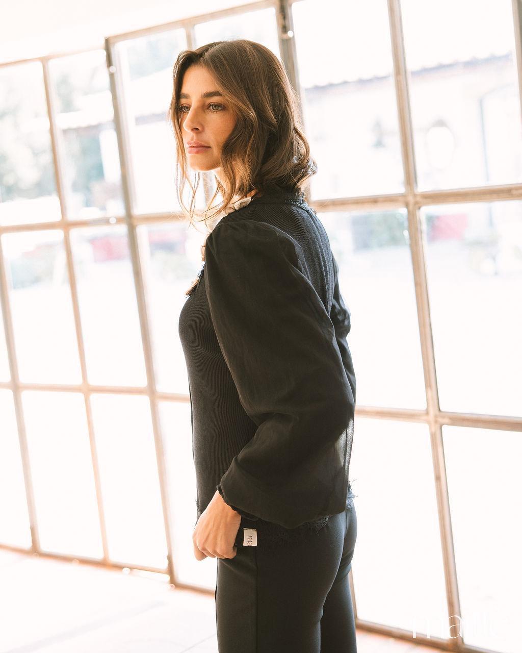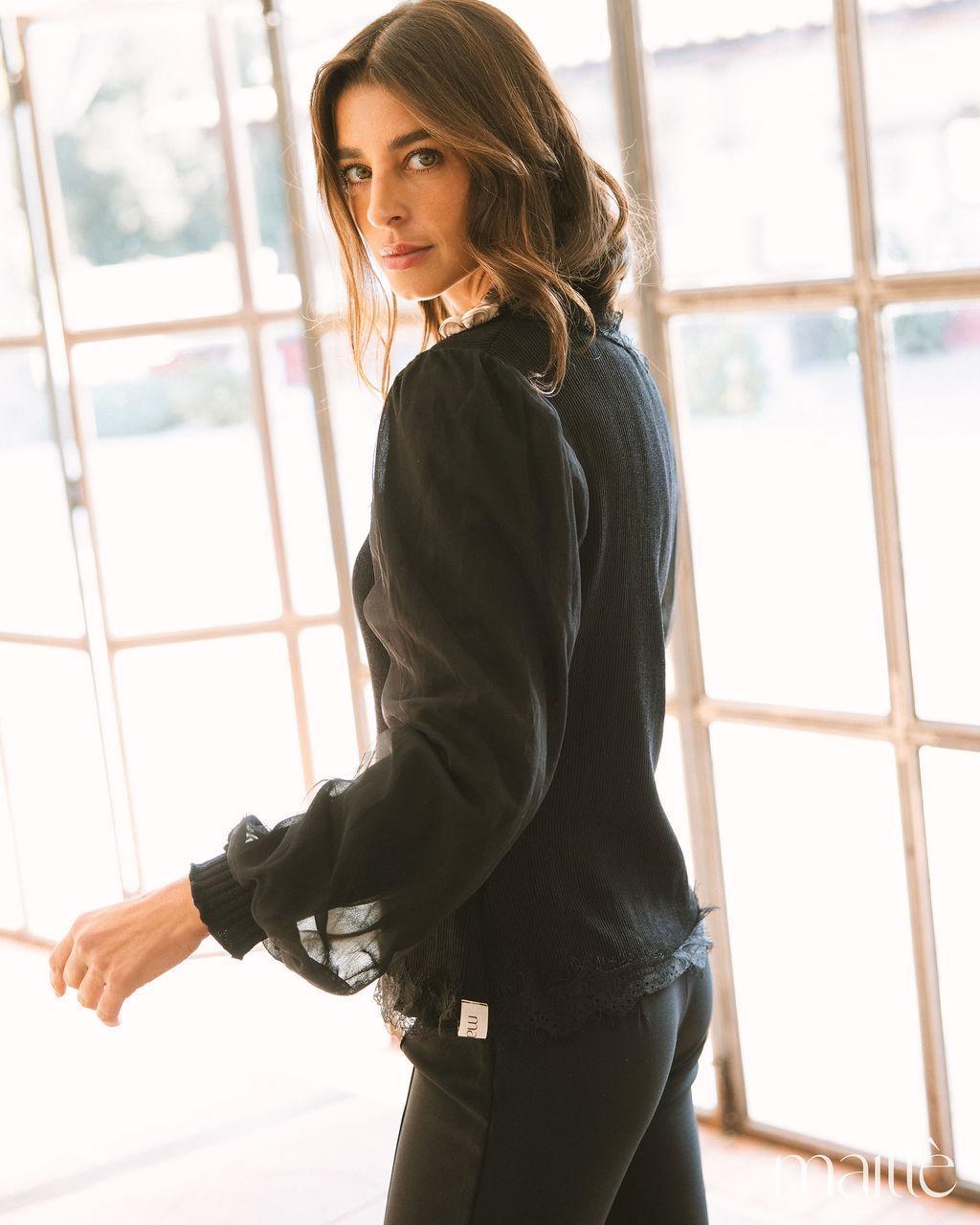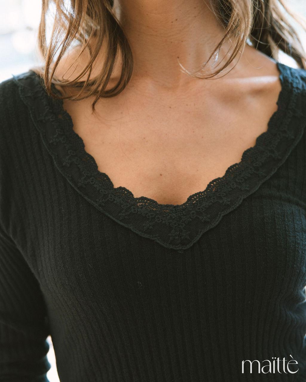 Conjunto de 2 peças composto por casaco e camisola básica, em tom preto. O casaco é de malha canelada, com detalhes em renda no decote e no cós. Botões frontais. Apresenta flores acetinadas, em tom bege, à volta do decote. Os punhos são em malha também. As mangas compridas, são em tule transparente. A camisola básica é de malha canelada, decote em V, com renda no decote.