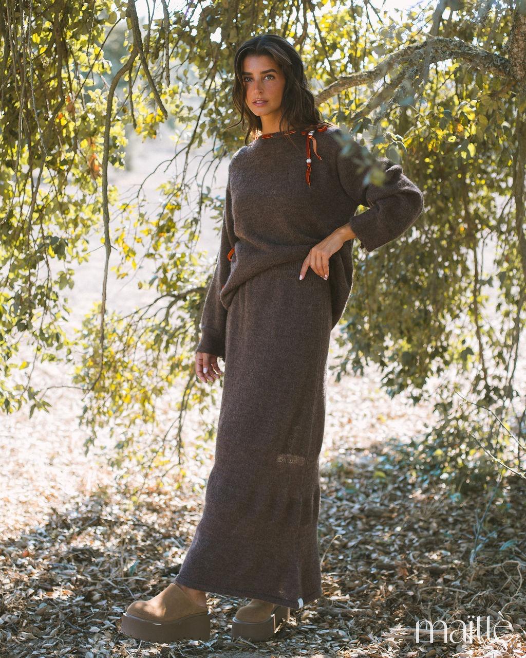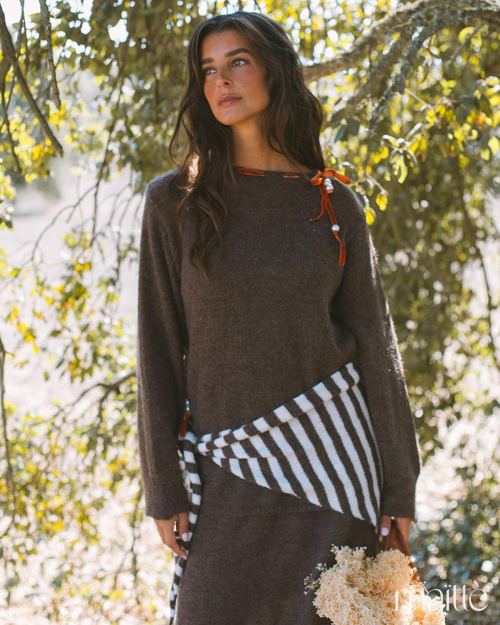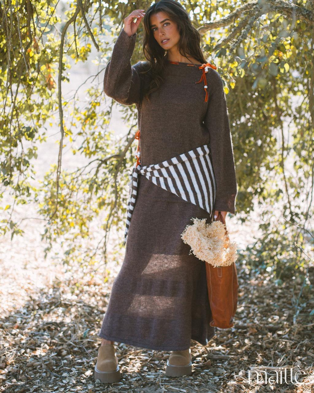 Conjunto de 2 peças, composto por saia de lã, em tom castanho, com cintura elástica para melhor ajuste e conforto e, lenço em malha de algodão, às riscas em tom castanho e branco.