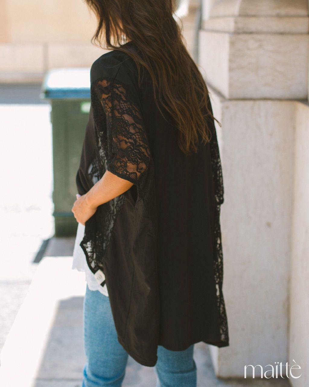 O casaco é oversize, de manga larga pelo cotovelo, com renda transparente.