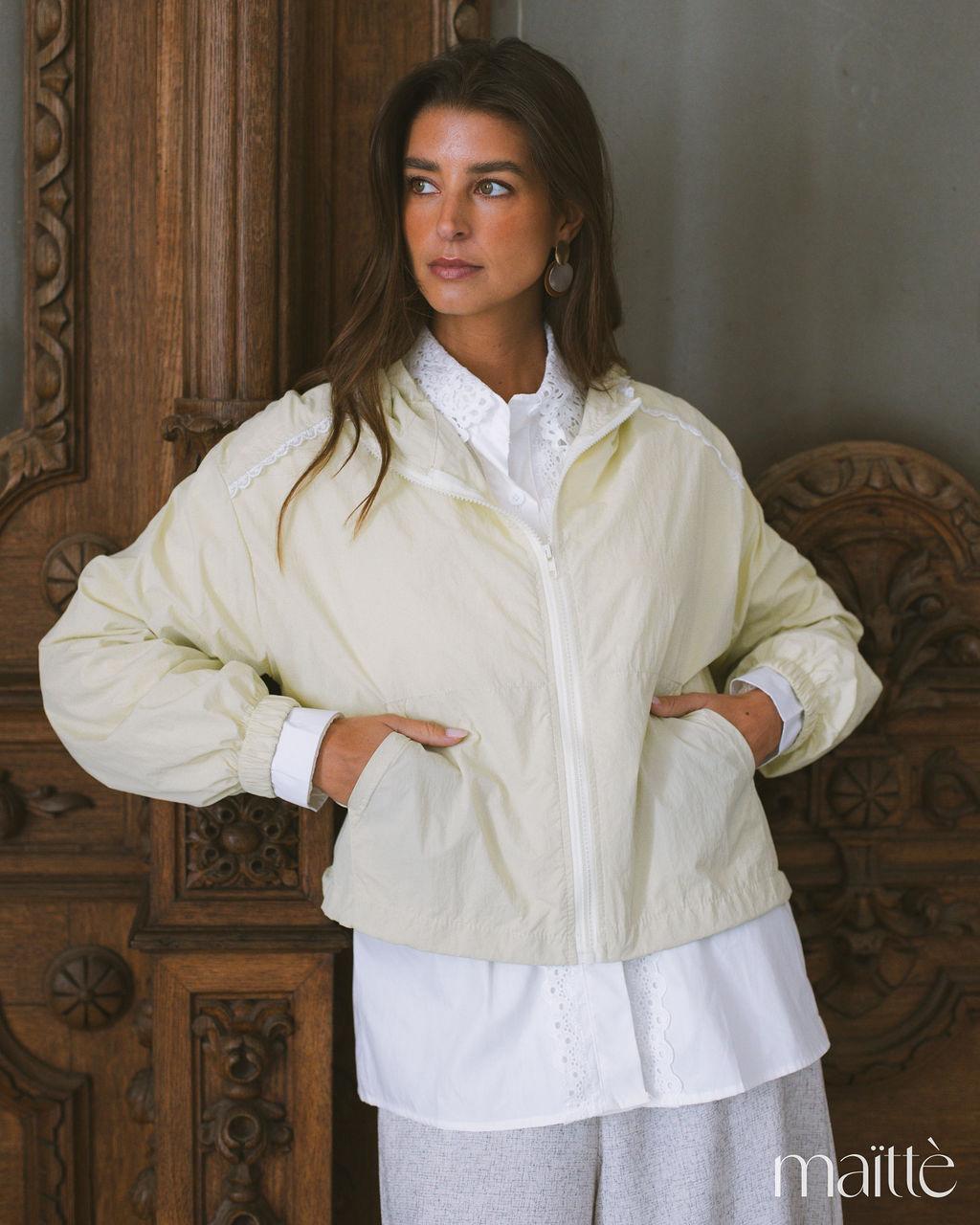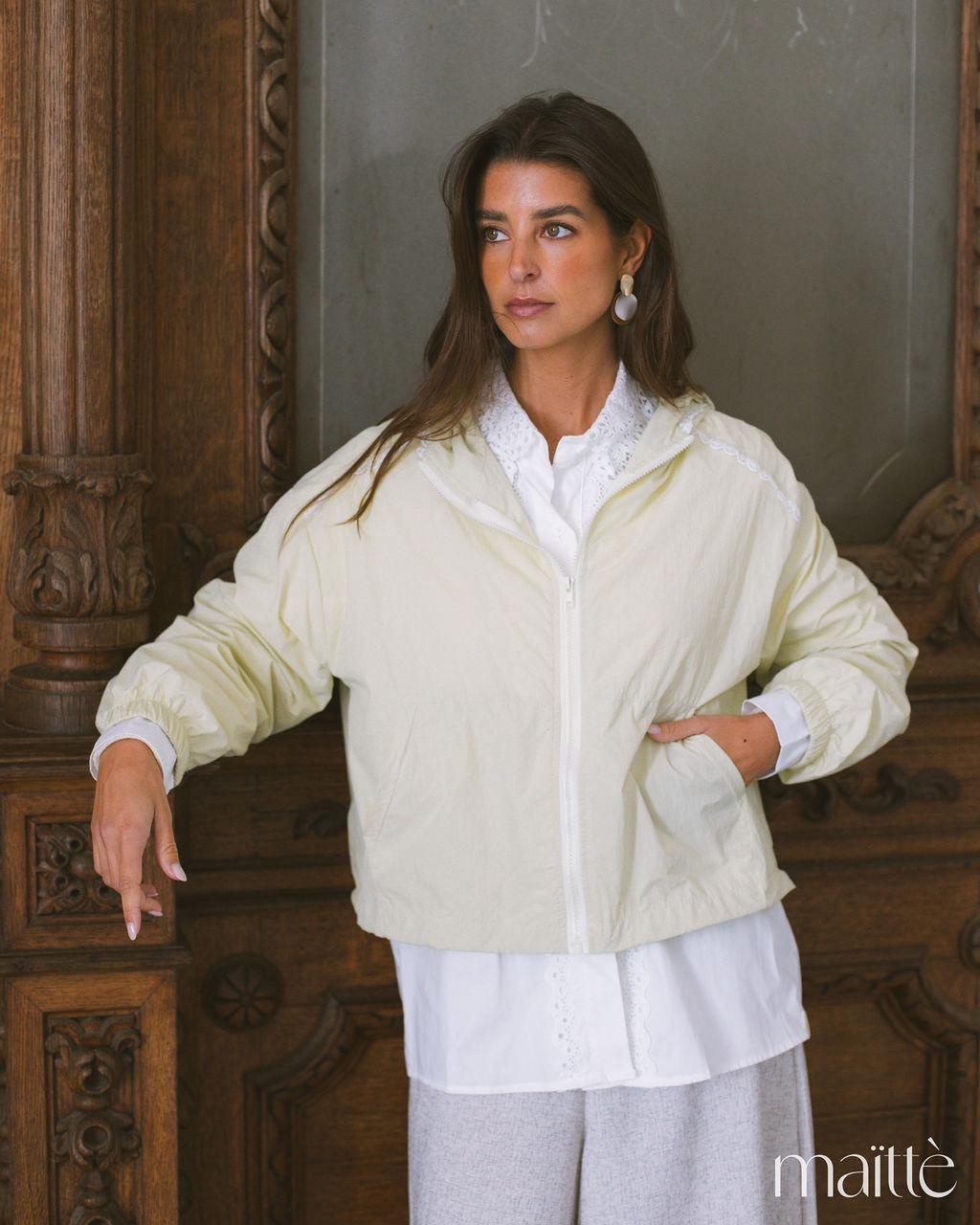 Corta-vento num tom verde água, com renda branca nos ombros e à volta do carapuço.