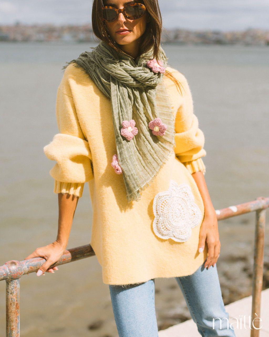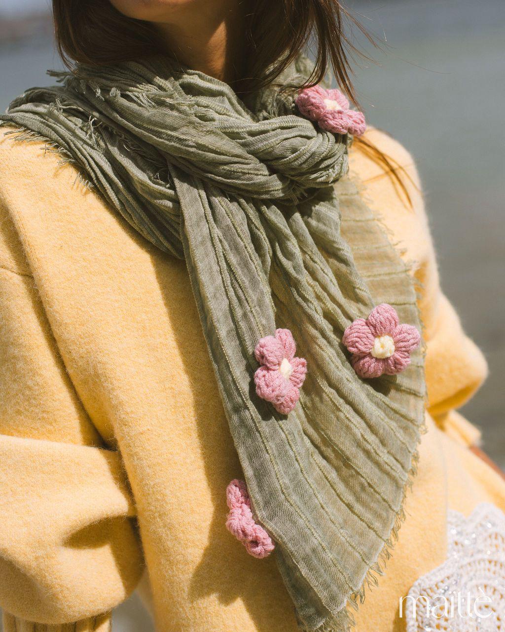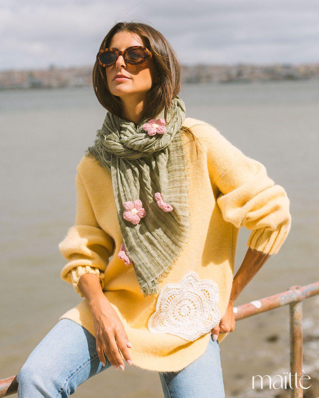Écharpe maxi, em tom verde seco com flores cor-de-rosa.