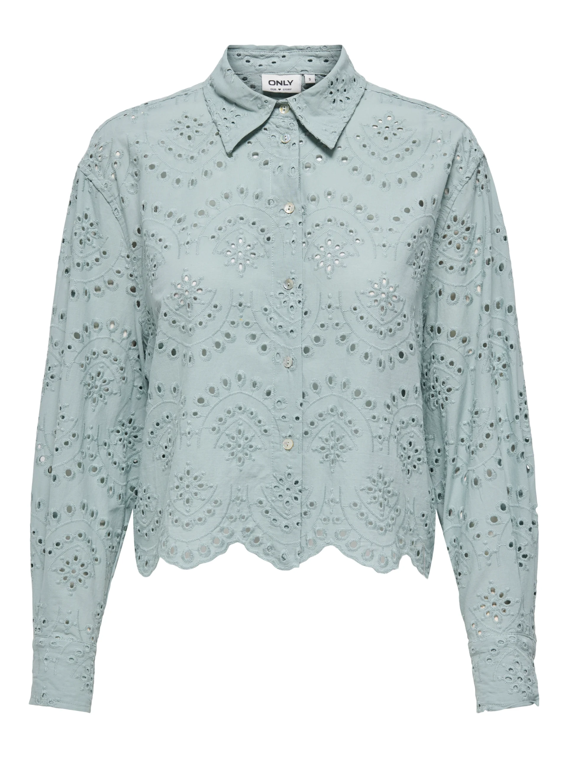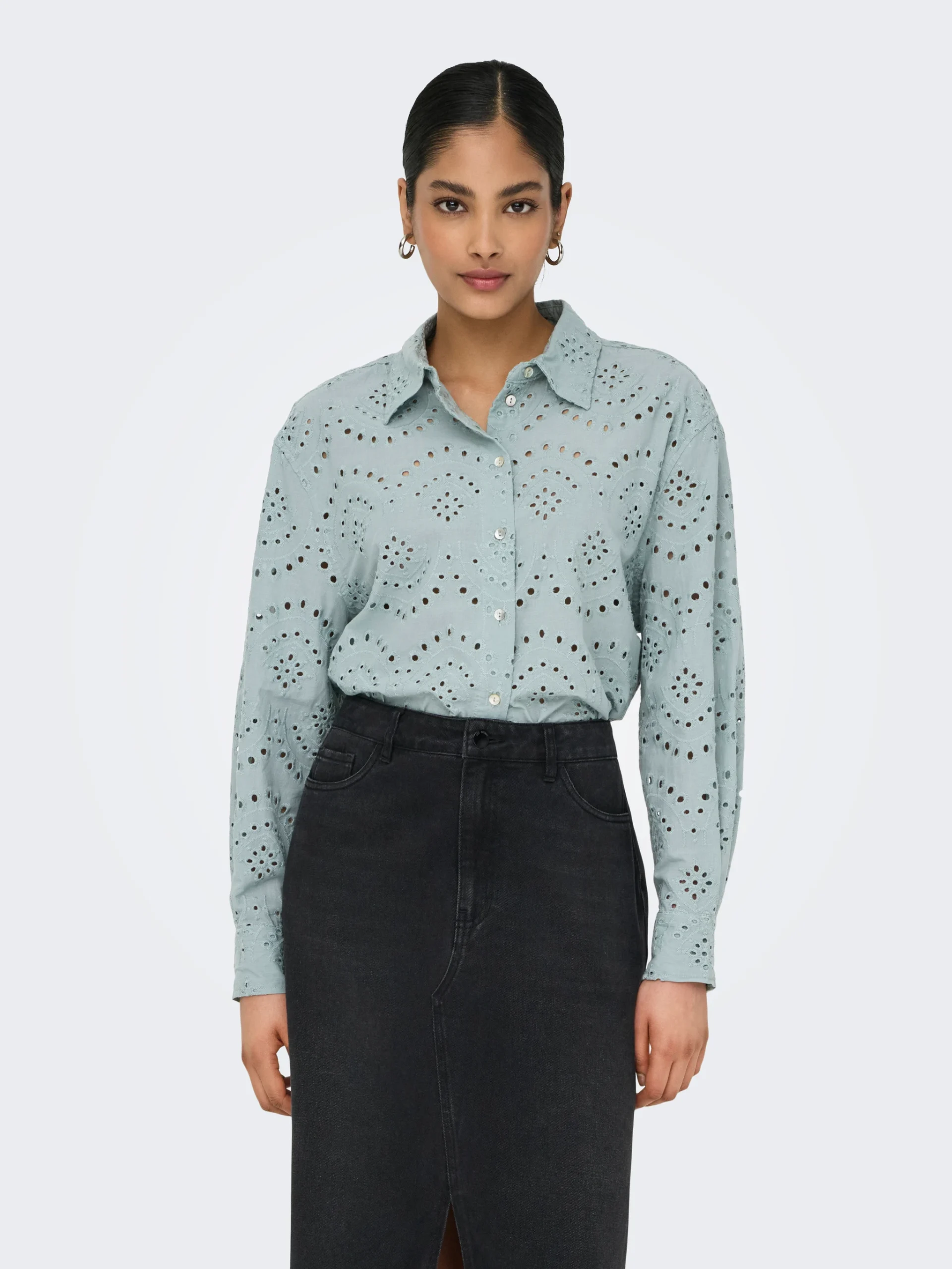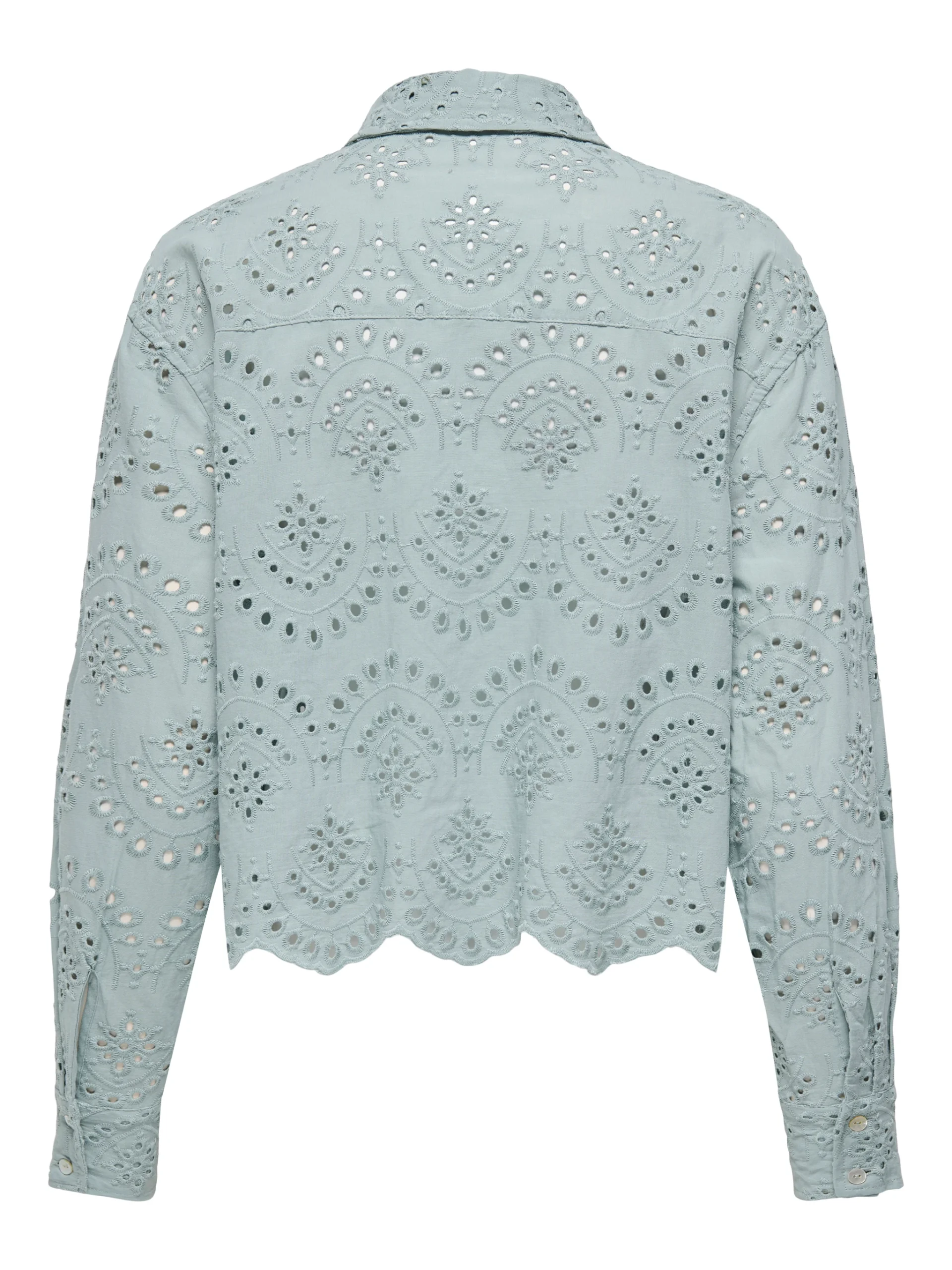 Camisa em bordado inglês, manga comprida com punho. Detalhe de recorte na base.
