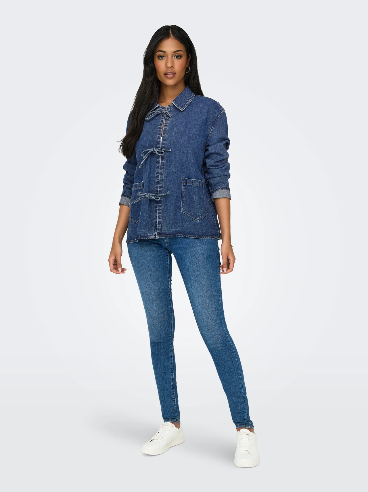 Casaco em ganga escura, ligeiramente oversize. Com gola, manga comprida e bolsos frontais. Detalhe de atilhos frontais para atar com lacinhos.