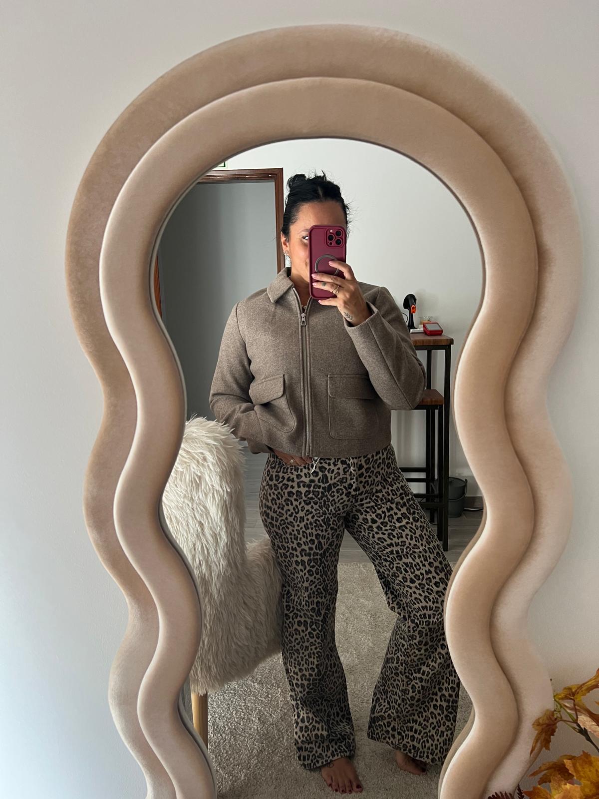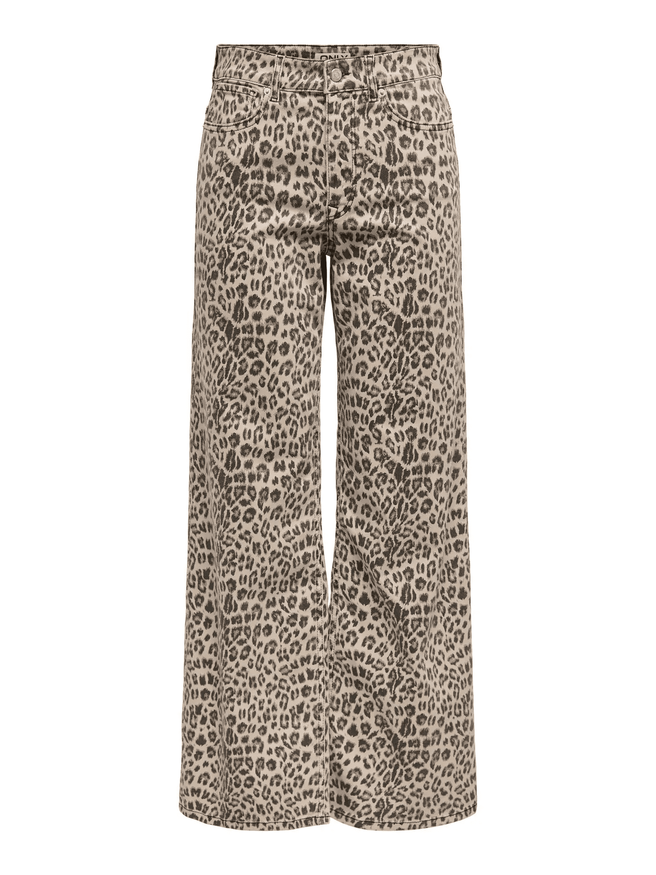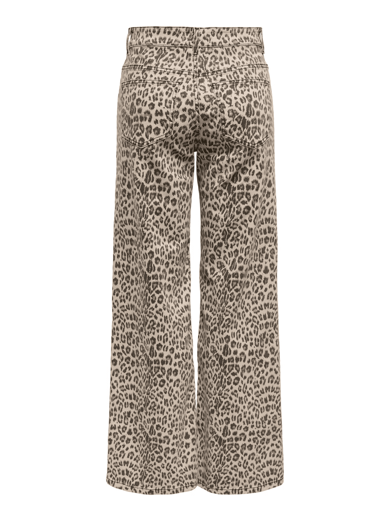 Jeans animal print – estampa leo – fundo bege, de cintura subida, wide leg.