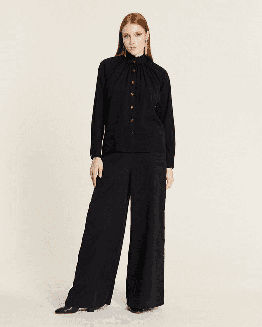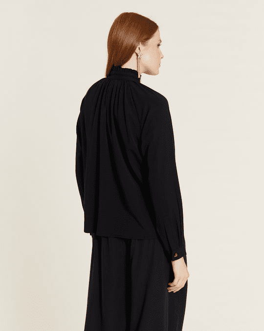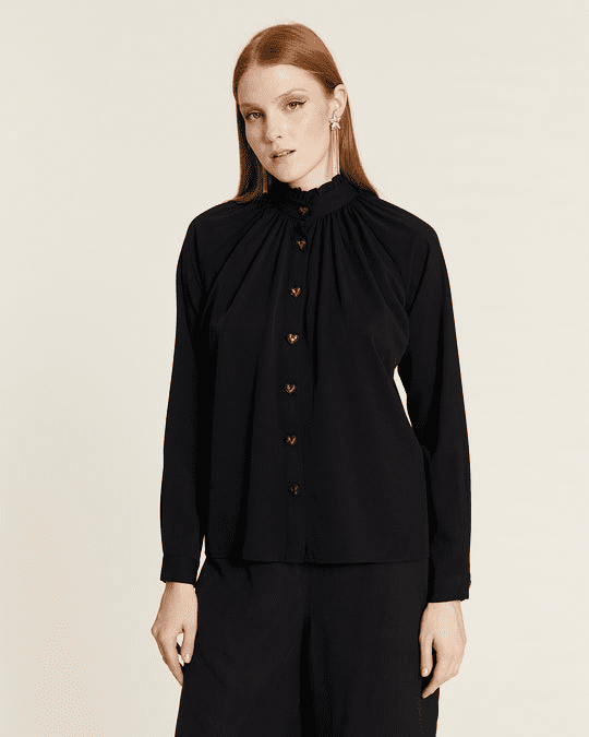 Camisa de manga comprida, preta, com botões dourados em forma de coração. O decote é subido, fazendo uma espécie de folho no pescoço.