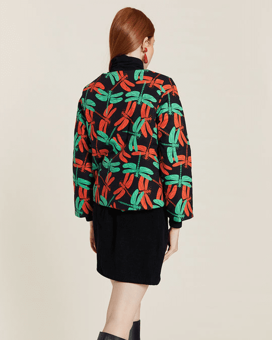 Casaco impermeável, curto, acolchoado. Decote redondo subido, sem gola. Fundo preto com libelulas verdes e vermelhas. Tem fecho frontal e molas de pressão. Bolsos laterais com fecho invisível.