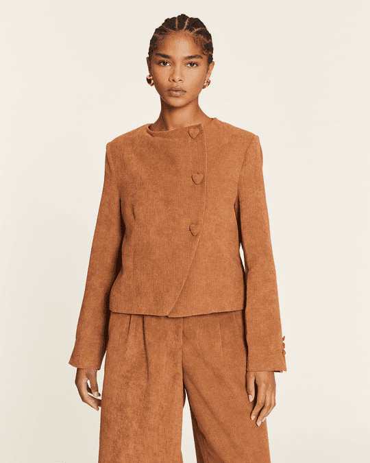 Jaqueta em bombazina tom caramelo, com decote redondo subido. Abotoa com botões forrados em forma de coração.