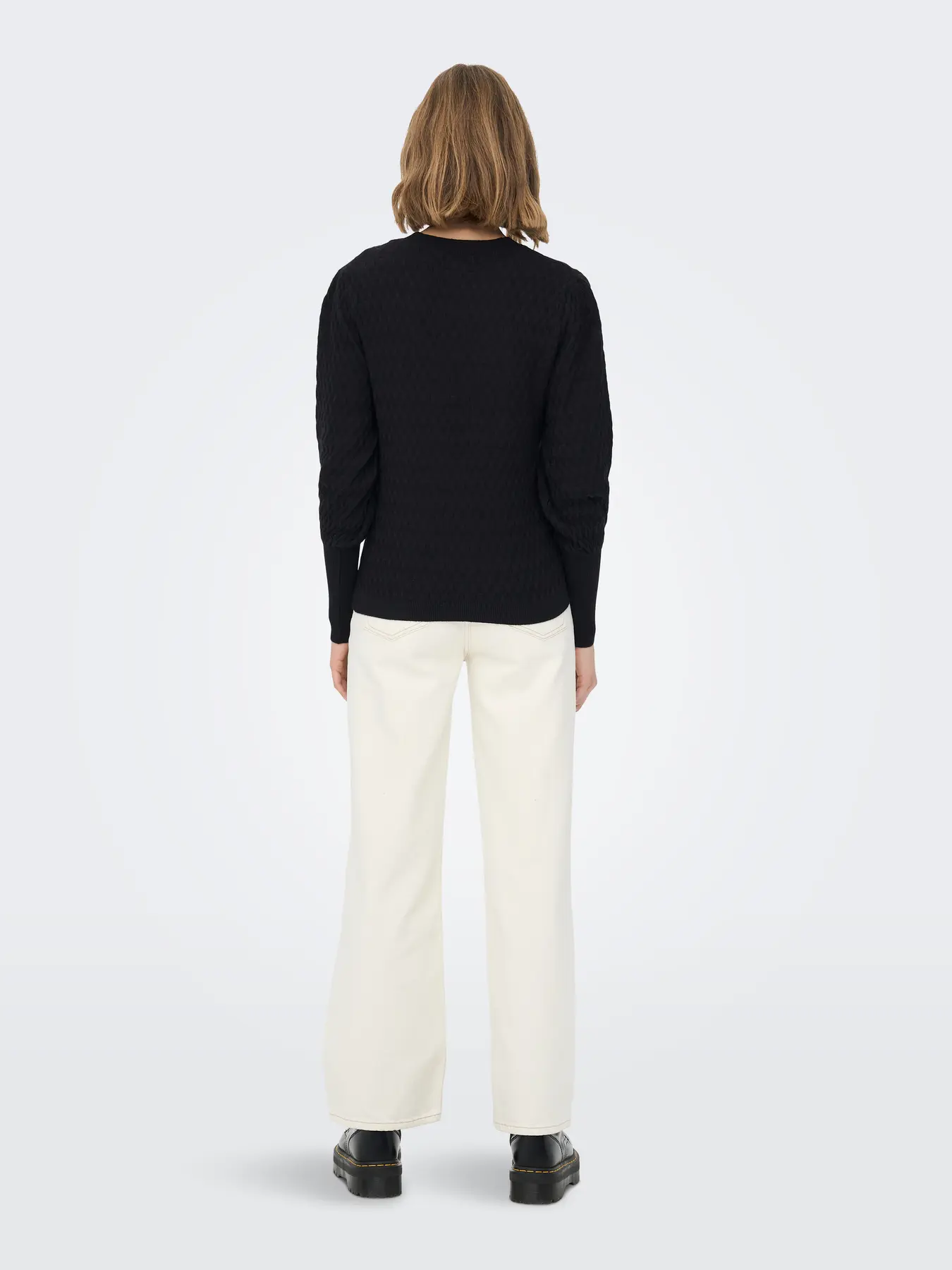 Pullover preto, de malha trabalhada, muito suave ao toque. Decote redondo. Manga ligeiramente larga com punho longo elástico.