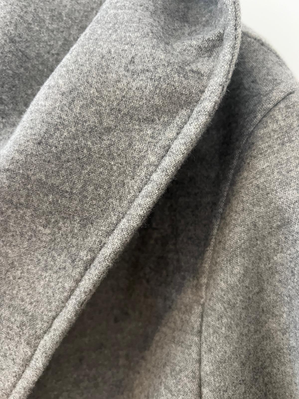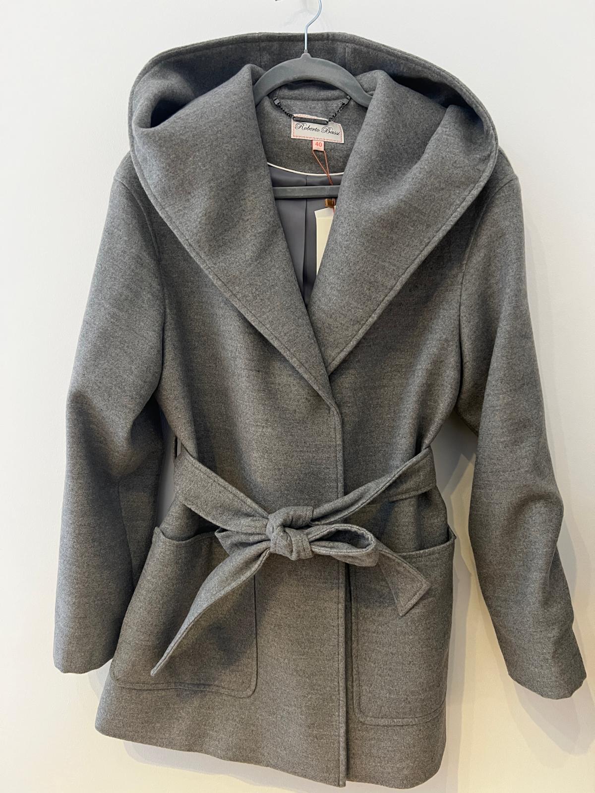 Casaco na cor cinza, de comprimento médio, numa fazenda leve. Tem capucho e gola larga e ata com cinto no mesmo tecido. Bolsos laterais.