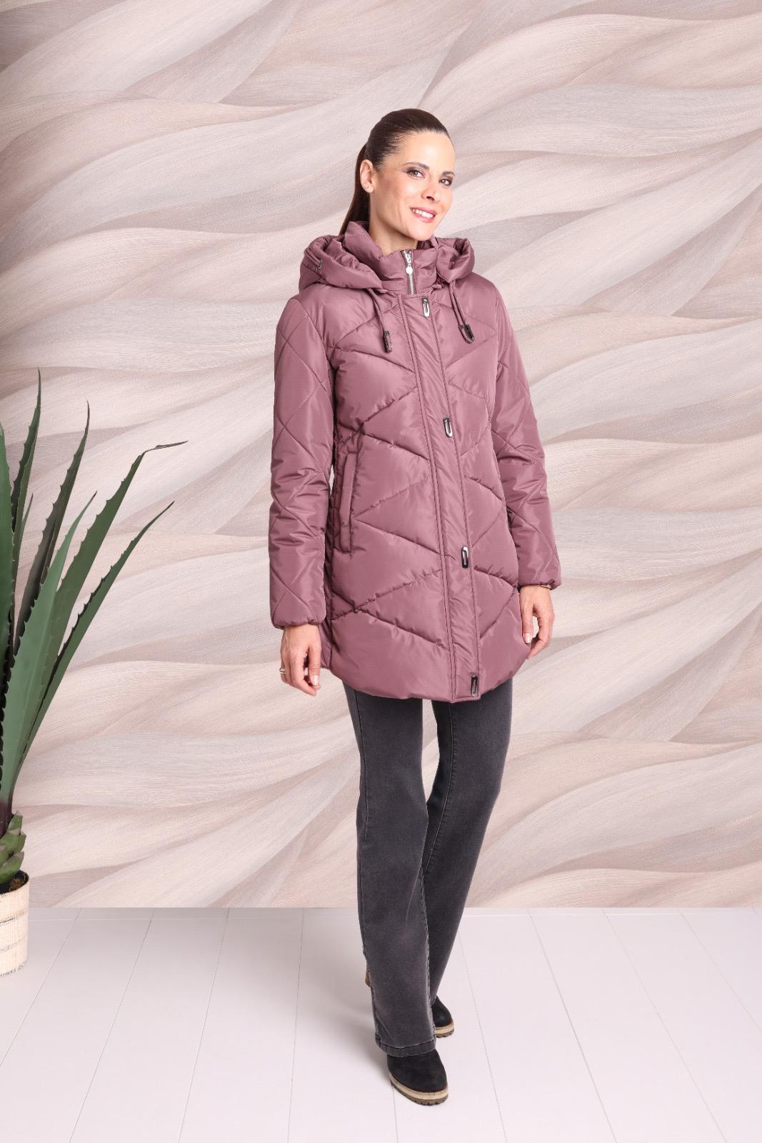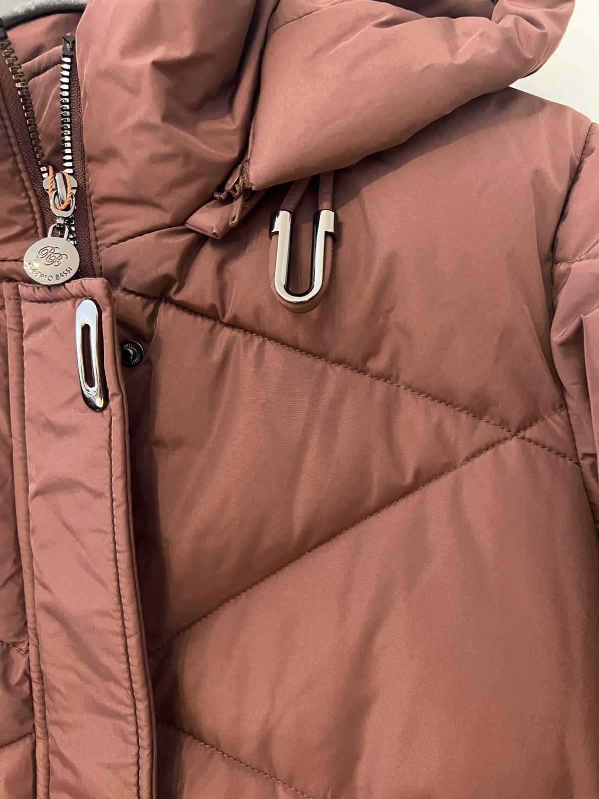 Parka acolchoada, em tom rose brown (rosa velho), de comprimento médio. Tem capucho.