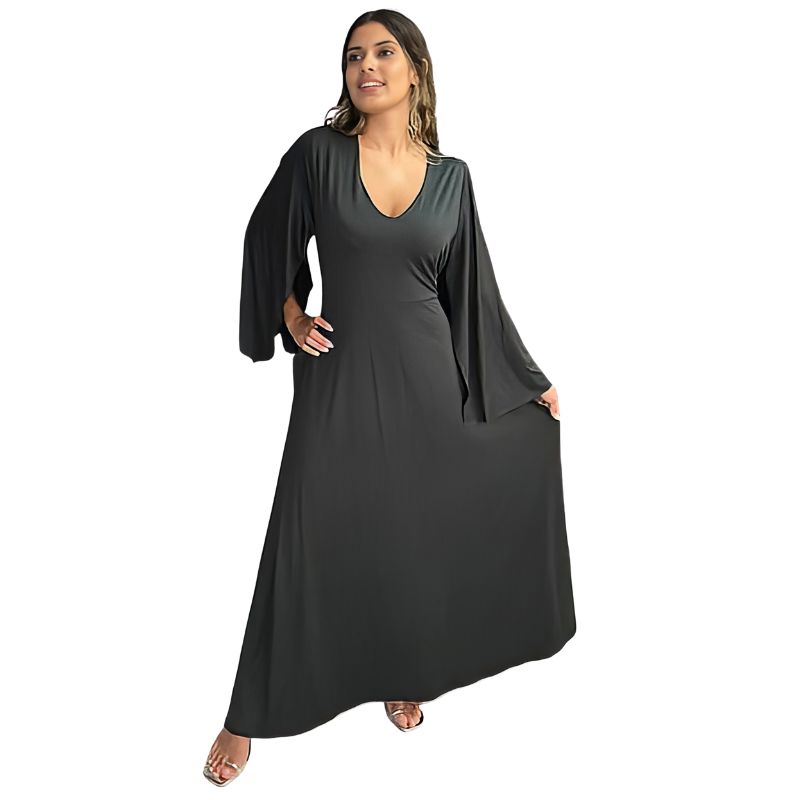 Vestido comprido, decote em V, manga comprida estilo “asa de morcego”. Saia évasé. Tem cinto no mesmo tecido para melhor ajuste.