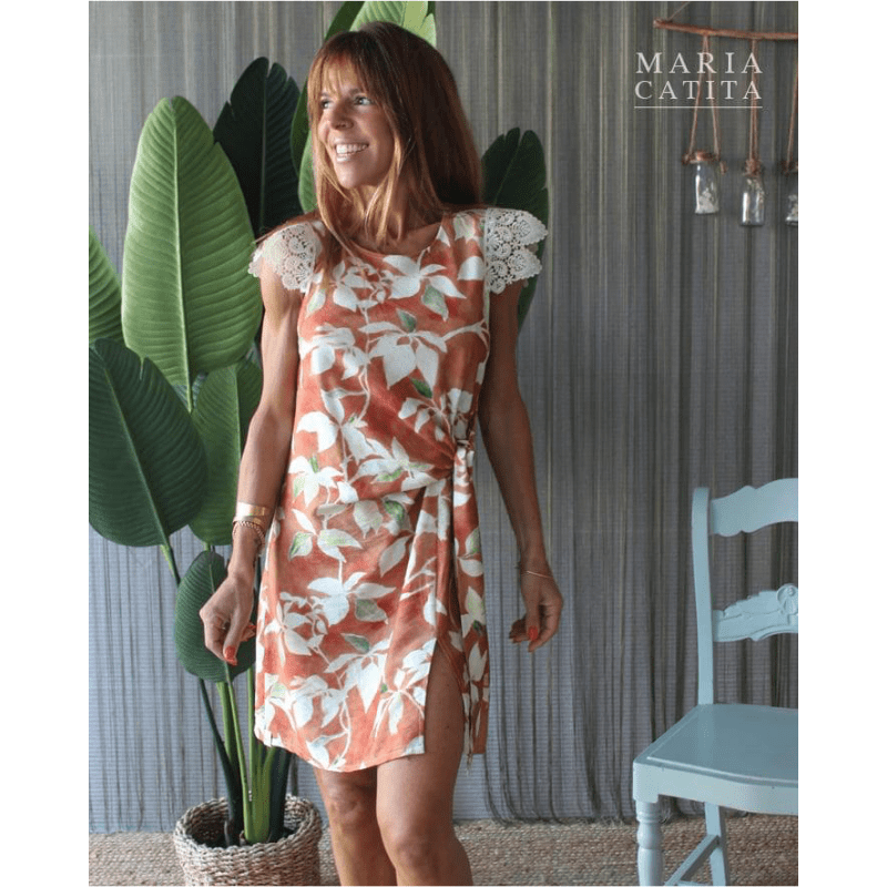 Vestido curto, estampa floral em fundo terracota. Repuxado lateral na zona da barriga, ajustável. Rendinha sobre os ombros.