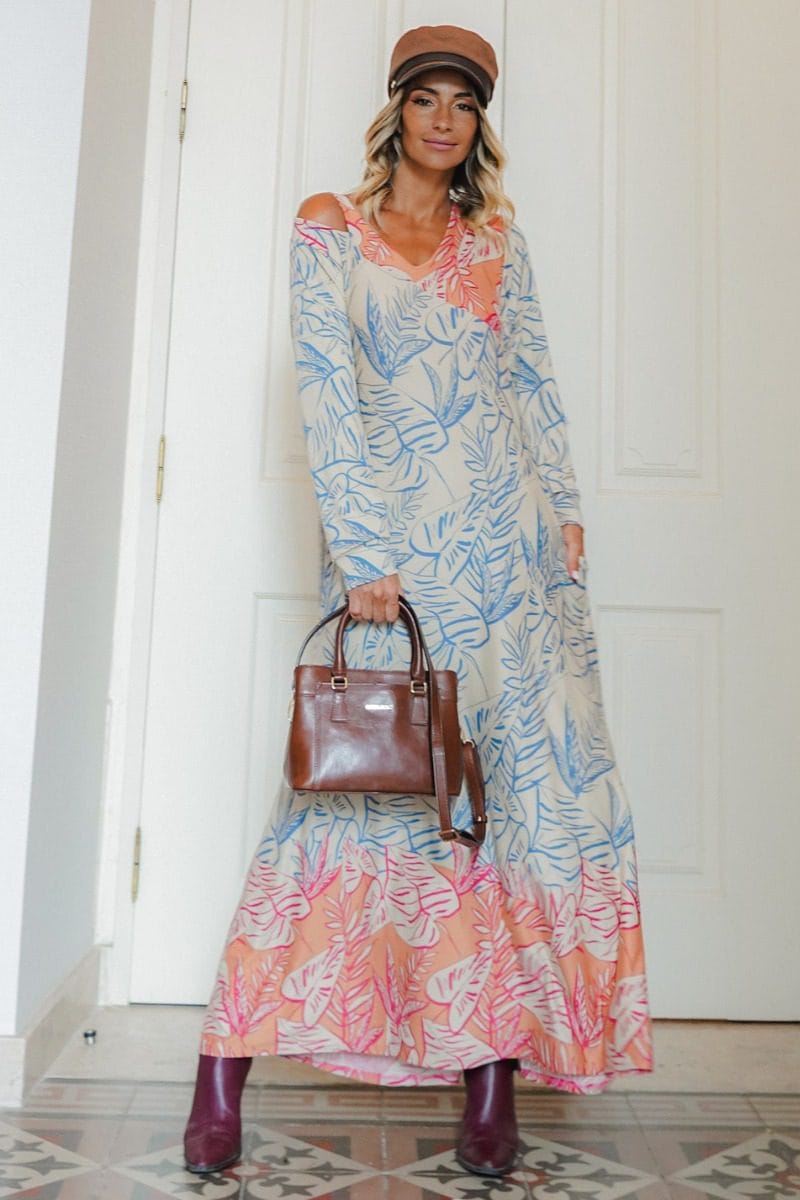 Vestido comprido, em estampa floral de vários tons claros. Manga comprida, com abertura num ombro. Decote em V. Bolsos laterais. Num tecido estilo malhinha, é ideal para as noites mais frescas de verão.