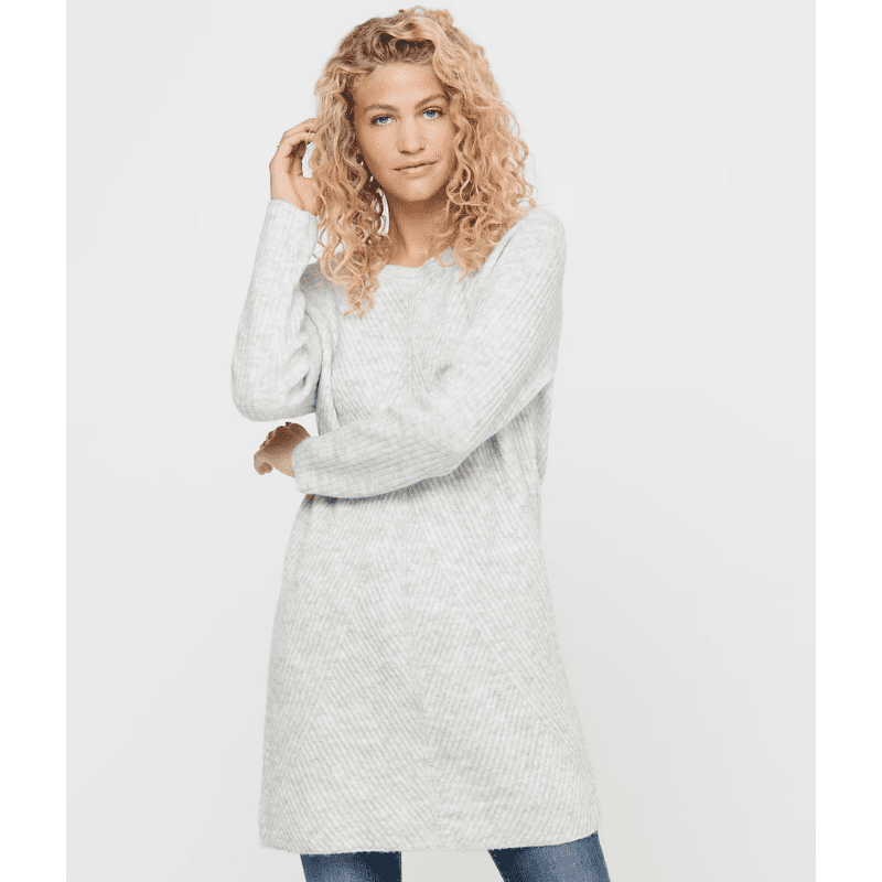 Vestido curto, de malha. Decote redondo. Manga comprida.