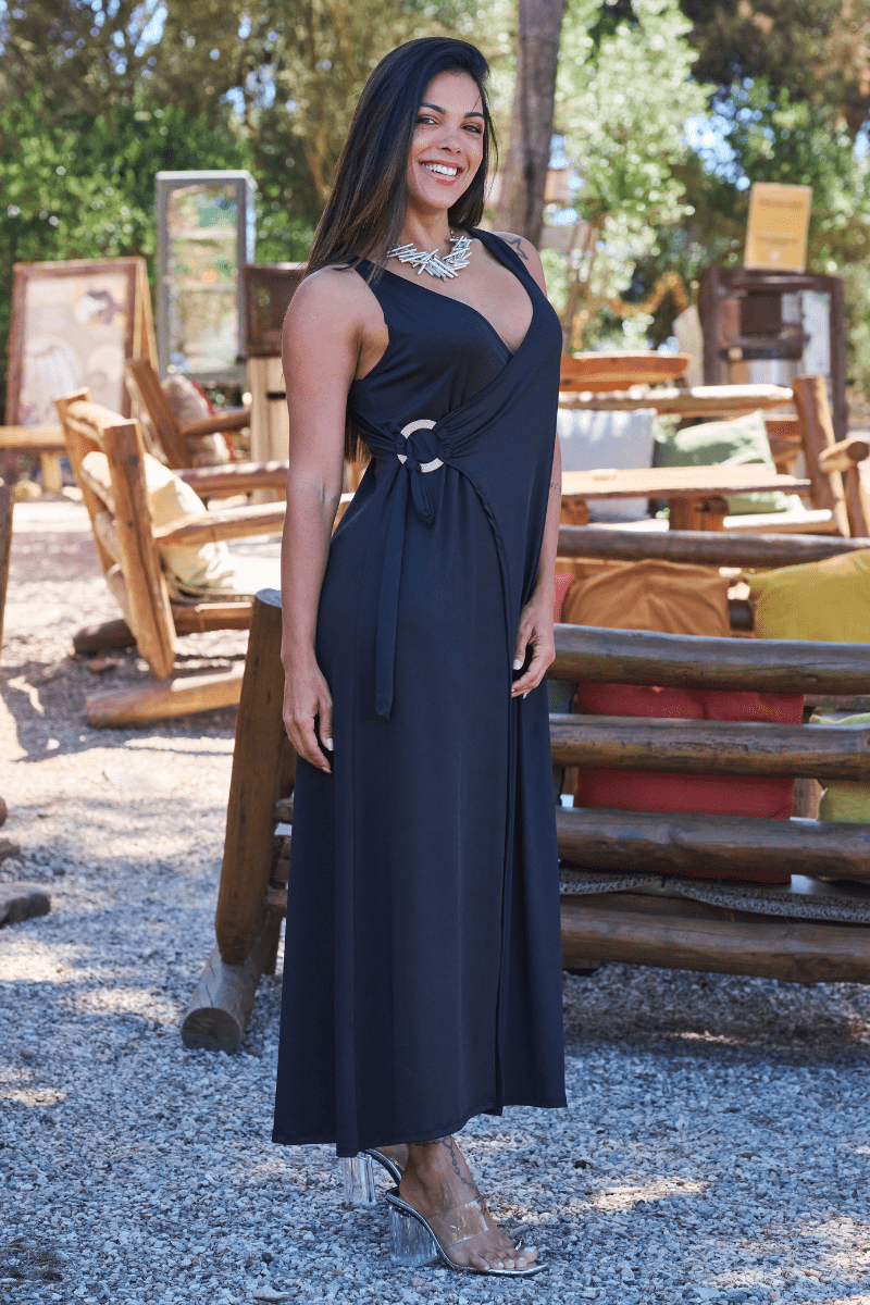 Vestido longo, traçado na frente, com atilho e fivela. Sem mangas.