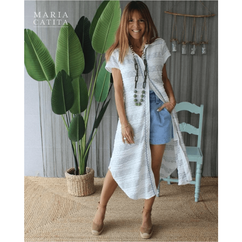 Vestido camiseiro (também pode ser usado como túnica), comprimento midi, ligeiramente mais curto nas laterais. Manga curta larga. Tom branco pérola com ligeiros apontamentos azuis.