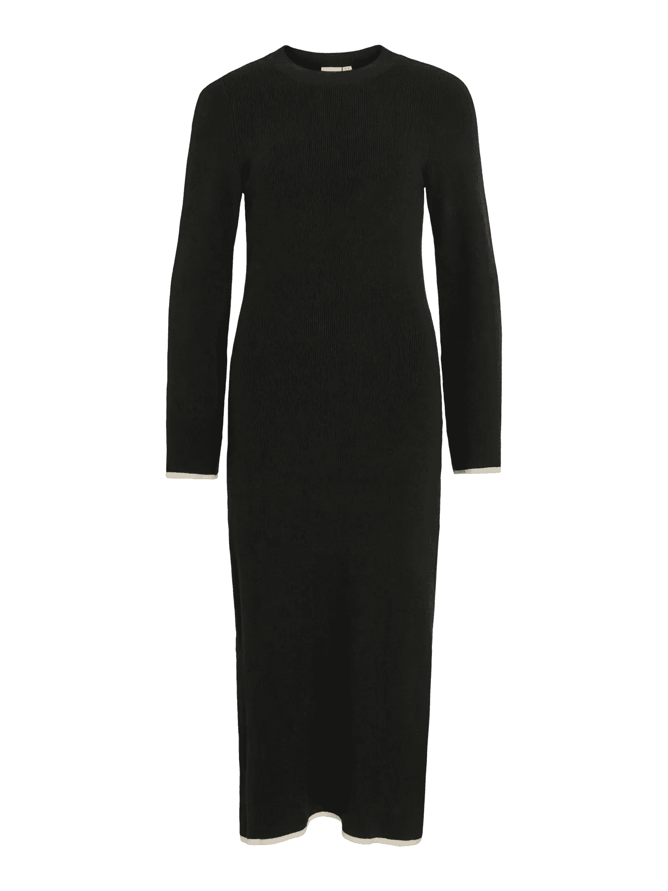Vestido de comprimento maxi, em malha, de corte justo sem colar. Manga comprida, decote redondo subido. Detalhe de barra fina bege no punho e na base. Racha lateral.