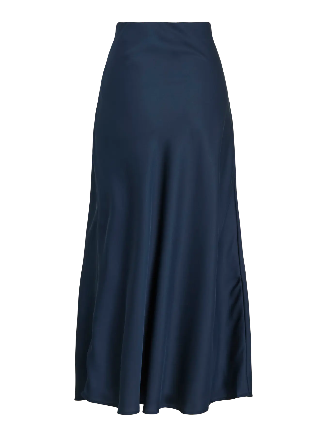 Saia de comprimento midi, acetinada, elástica na cintura.