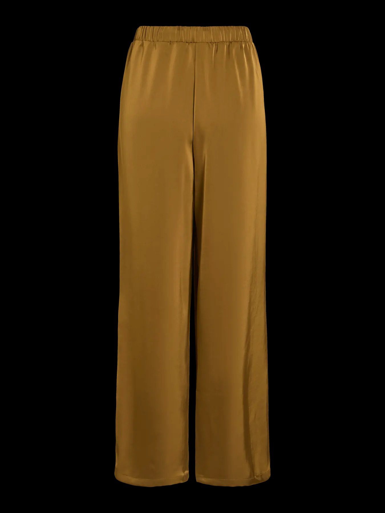 Calça acetinada, larga, em tom mostarda. Cintura elástica e com cordões, para melhor ajuste. Bolsos laterais.