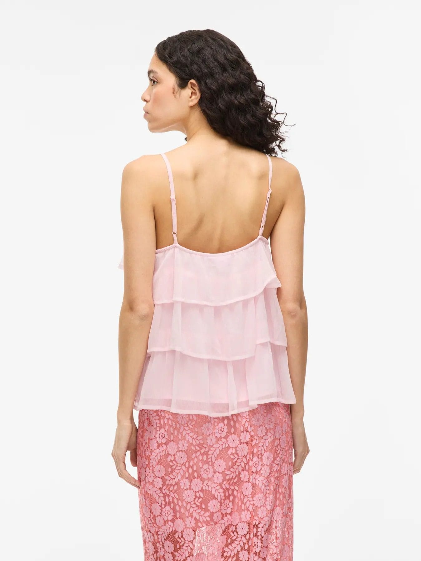 Top rosa pastel, de alça fina regulável, forrado. Decote em V. Elástico nas costas para melhor ajuste.