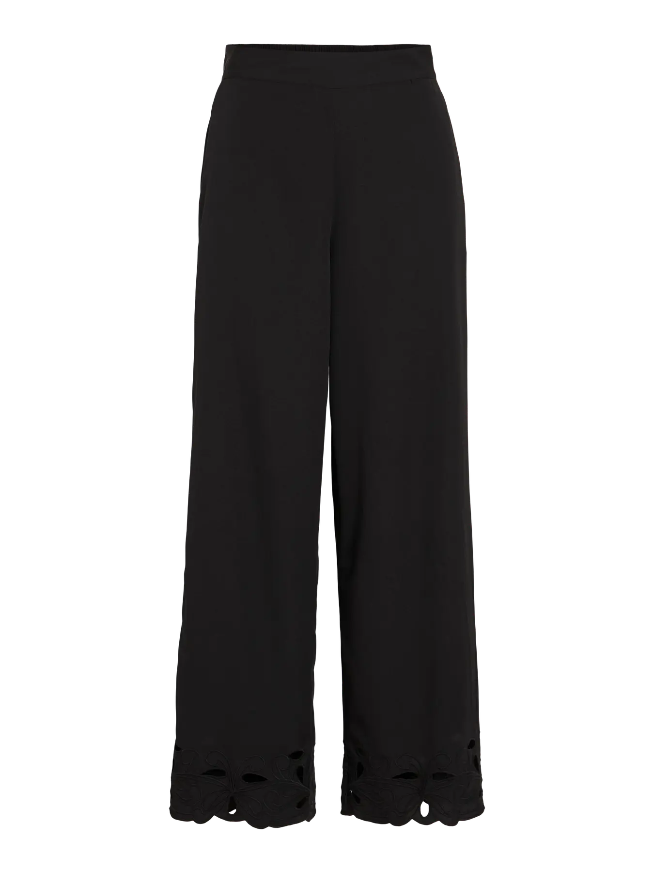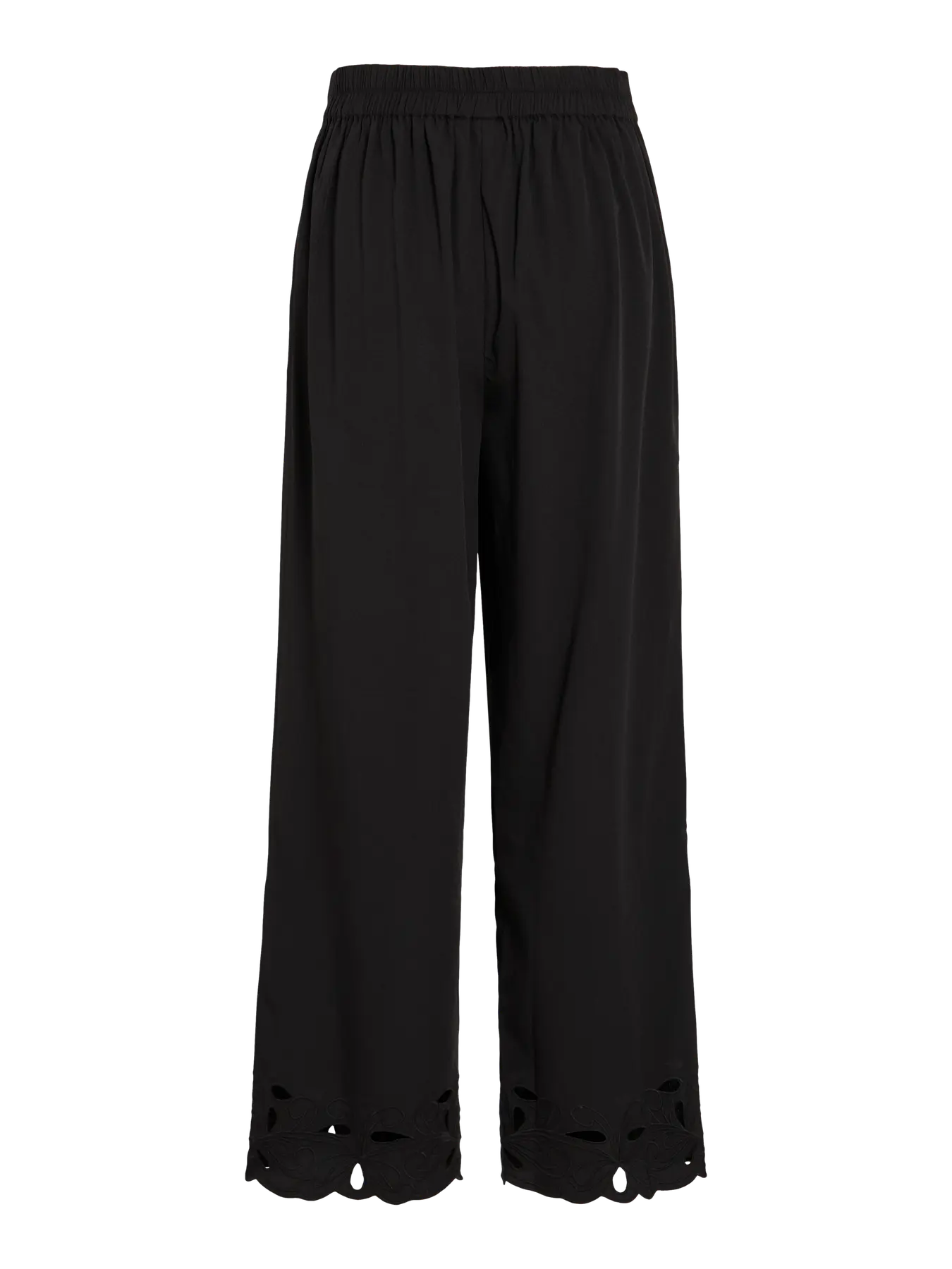 Calça estilo boho-chic, em tom preto, de cintura subida (costas elásticas), com bolsos laterais. Corte direito, com perna recortada em baixo em forma de flor.