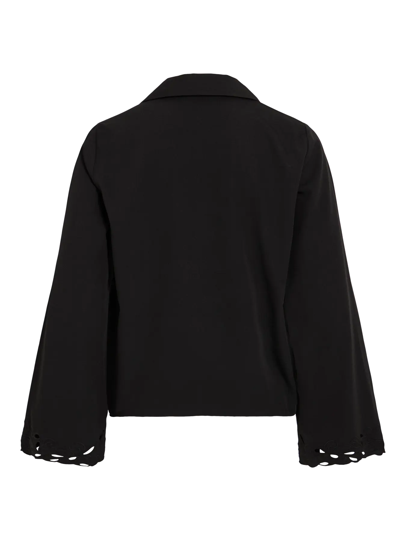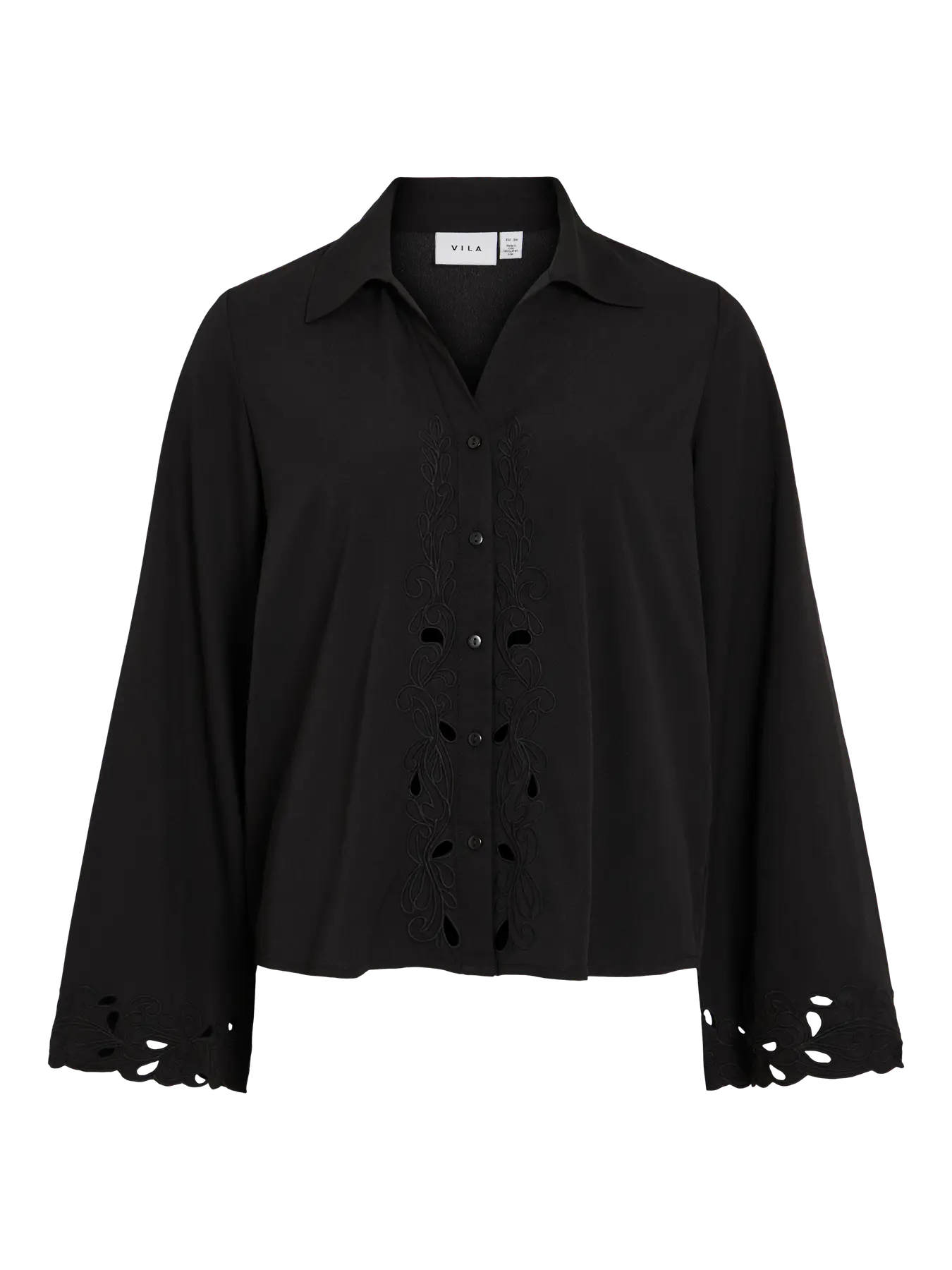 Blusa/camisa boho-chic, em tom preto. Manga comprida, larga, solta, com recortes na base em forma de flor, recortes esses que acompanham igualmente toda a zona frontal dos botões. As costas são lisas.